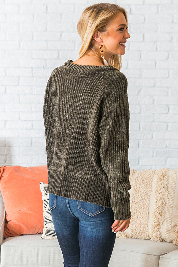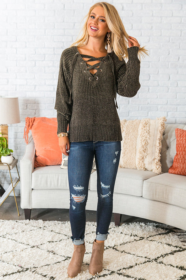 Fireside Champagne Lace Up Chenille Sweater in Army Green
