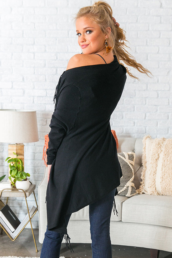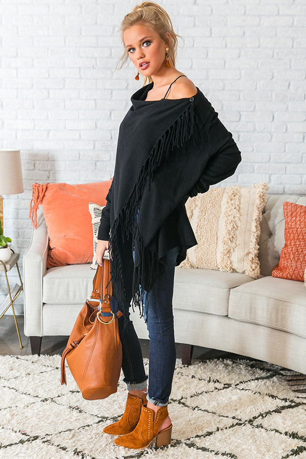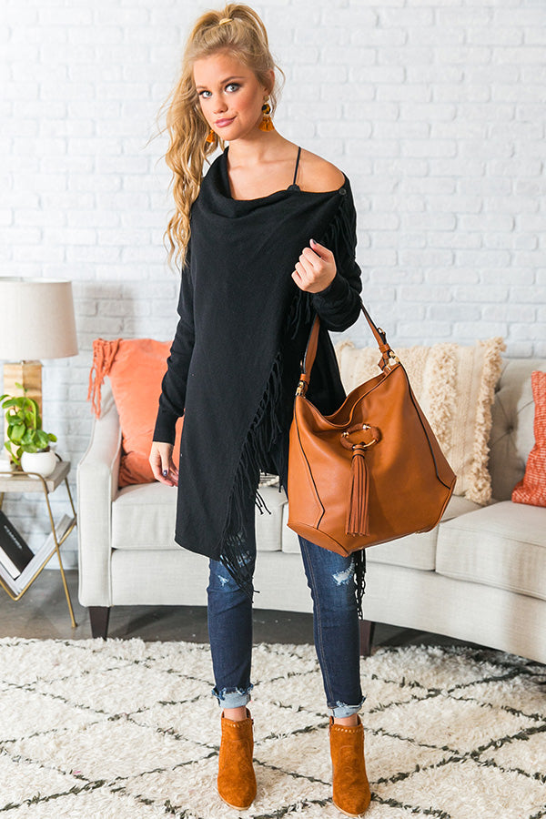 You and this knit crossover sweater are sure to be FRINGE forever! This fringe trimmed cardigan/sweater has long sleeves & a relaxed knit bodice that wraps & buttons on each side of the neckline; transforming this cardigan into a sweater. Whether you rock this fabulous fringed knit as a cardigan, or as a sweater, you will love the versatility this piece offers you.