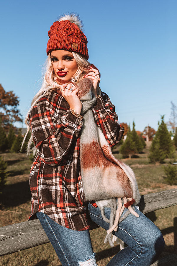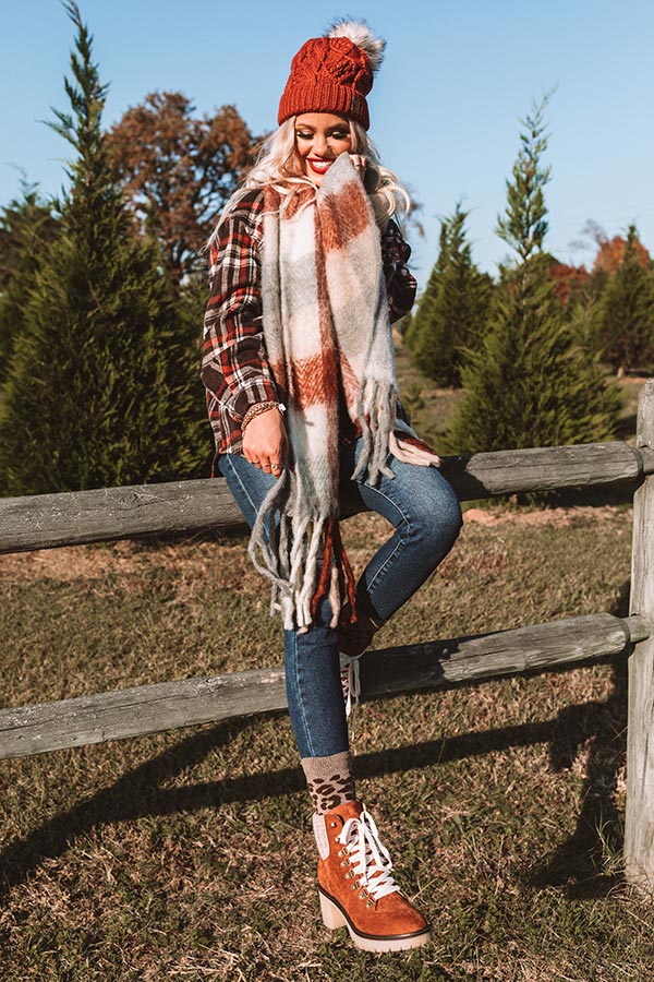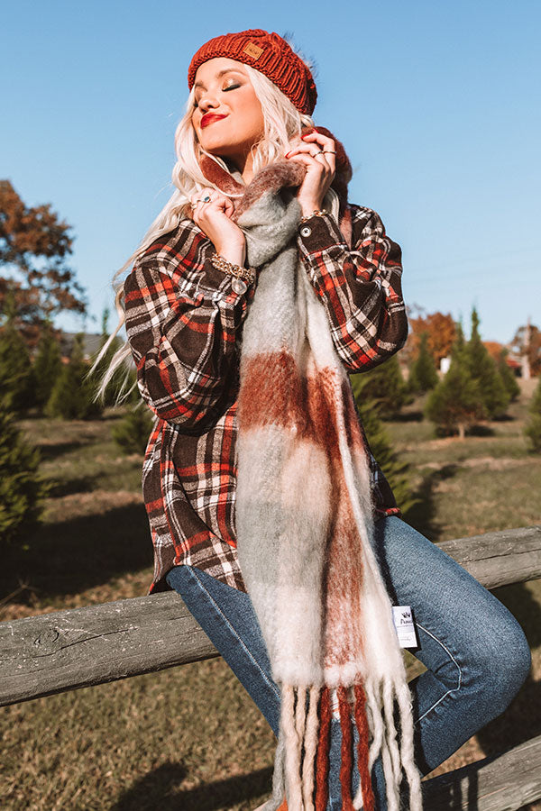 We have no doubt you will want to have this darling scarf in the next chapter of your fashion story with its ultra soft and lightweight material patterned with an oversized rust, grey, and ivory plaid print and ultra frayed trim detailing!