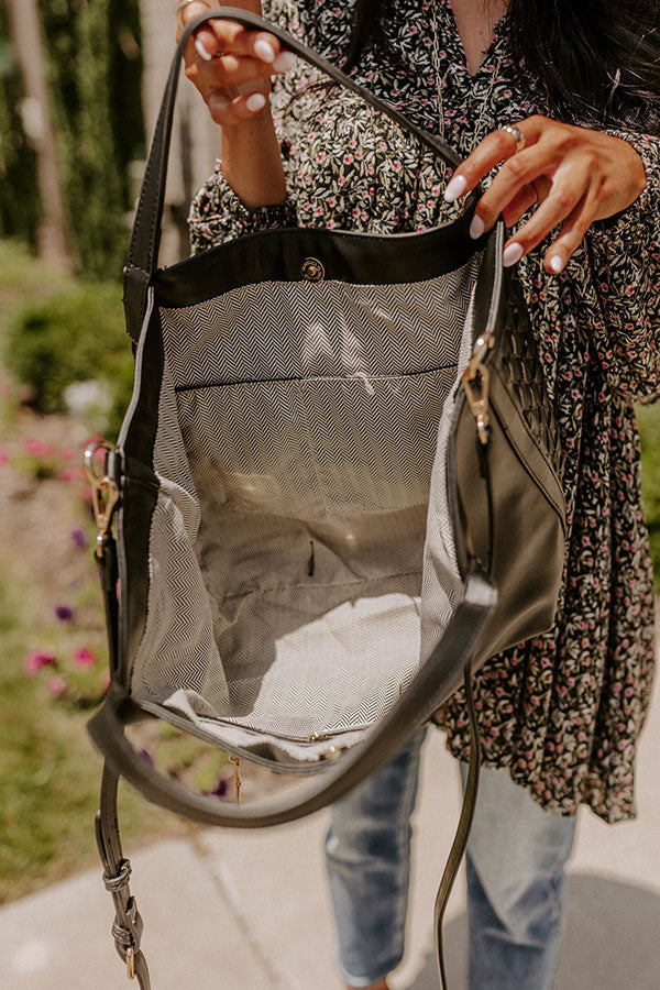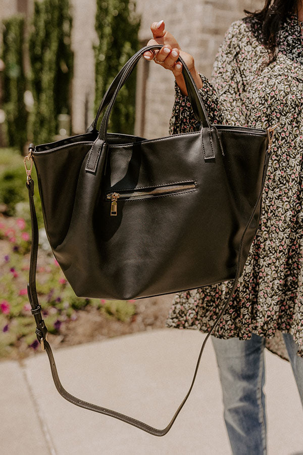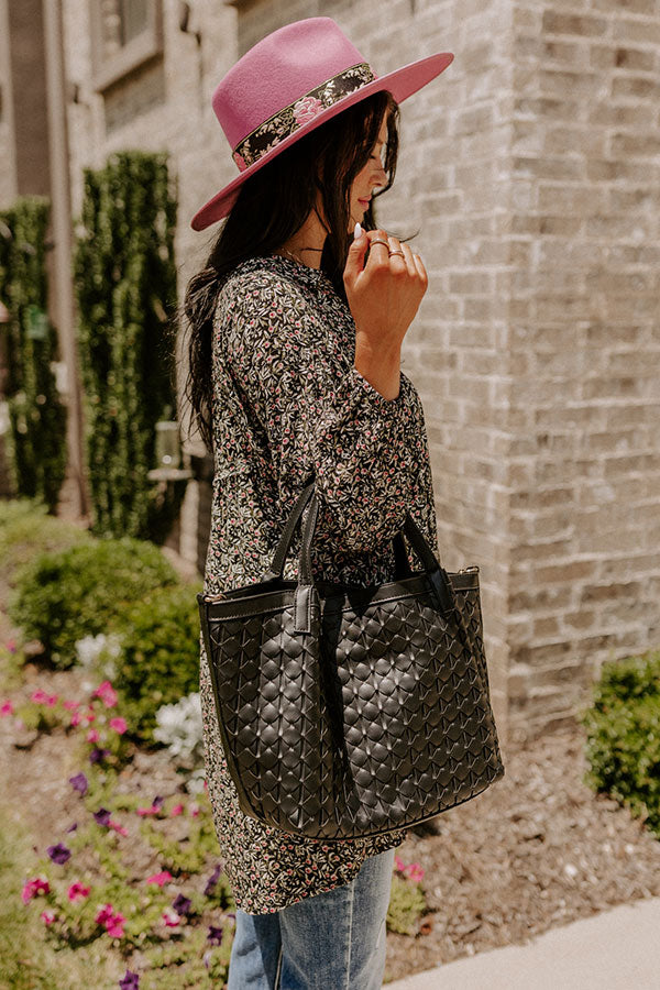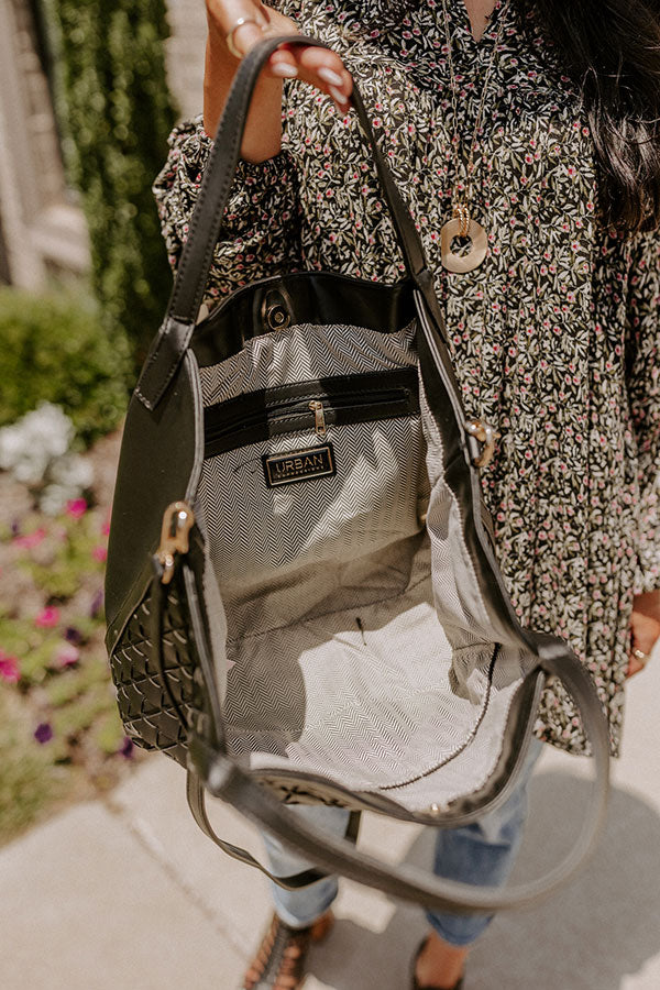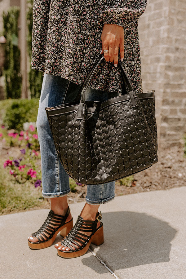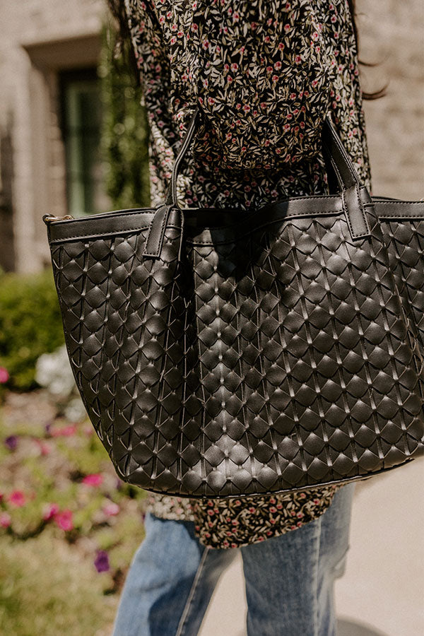 The perfect everyday carry-all, our practical yet pretty black 'Next One Up' tote features woven faux leather material, two tote handles, a removable and adjustable shoulder strap, a zip closure pocket in the back, and a spacious fully lined interior with a snap button closure and an additional zip closure pocket inside!