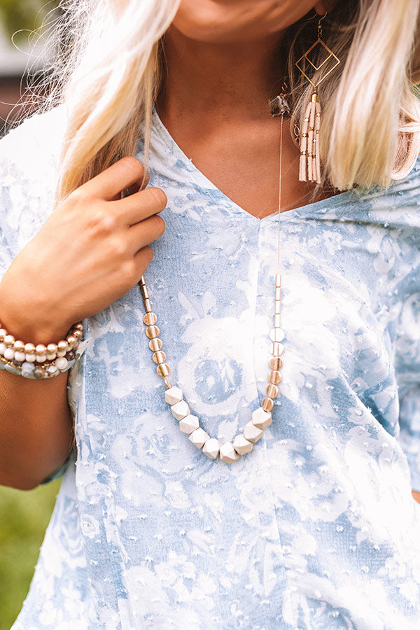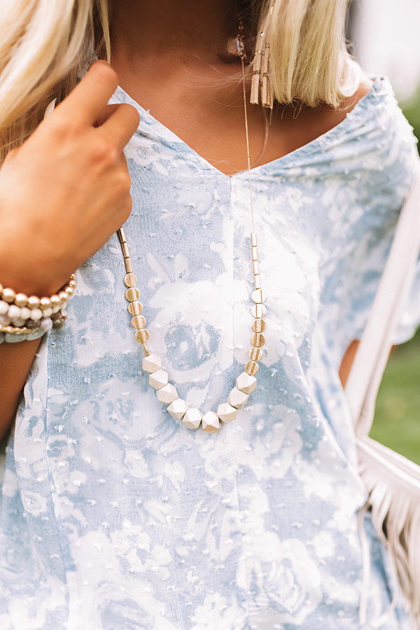 You will be a nice sight to "sea" when you accessorize with this gorgeous statement necklace featuring a long dainty gold chain with gold cylinder and circle beads and larger grey geometric beads!