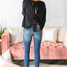 Cuddle up in this cute & cozy tie back sweater! This sweet eyelash knit sweater has a rounded neckline, long sleeves, a relaxed bodice & a swoon-worthy split open-back (accented with silver grommets) & trendy tie details.