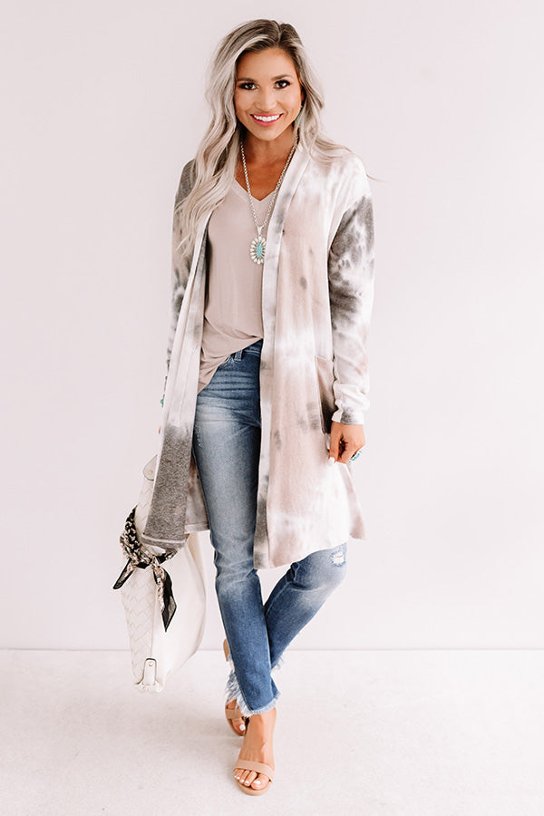 Cozy up for a "night in the redwoods" with this adorable cardigan featuring soft lightweight material patterned with grey/brown and blush hued tie dye, long loose sleeves, low accent side pockets, and a relaxed open front silhouette that falls into a straight mid-thigh length hemline! You can layer this versatile piece with just about anything from a basic tank to a sweater, jeans to dresses, wedges to sandals, clutches to totes, and hats to earrings for a variety of cold weather ready looks! Measurements