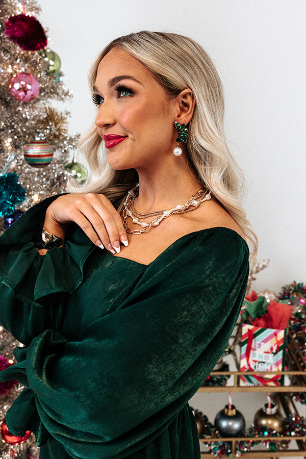 - Beautiful green rhinestone earrings with dangling faux pearls and gold accents