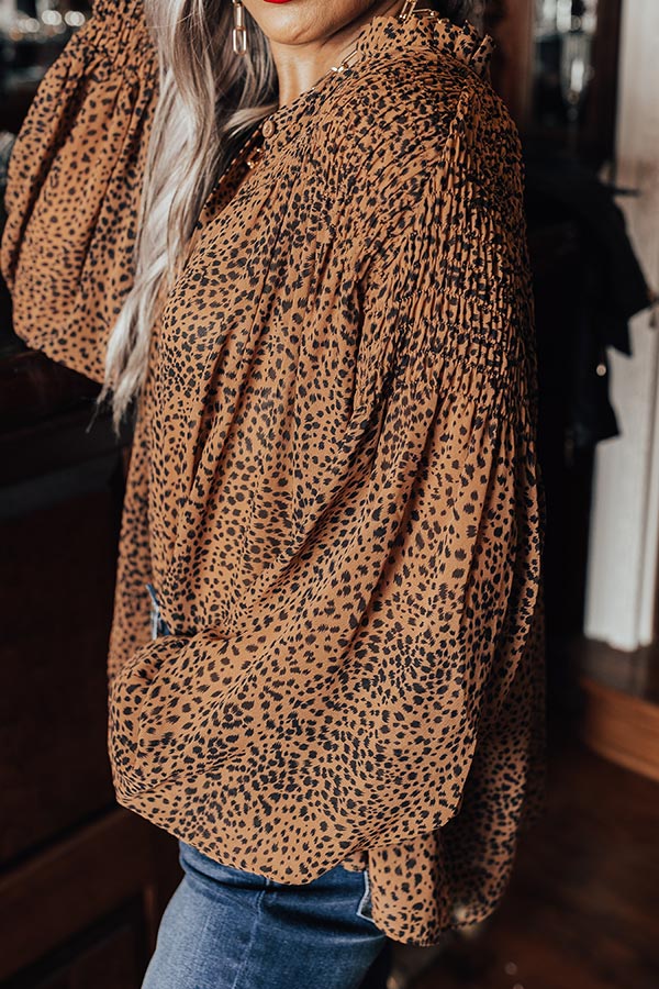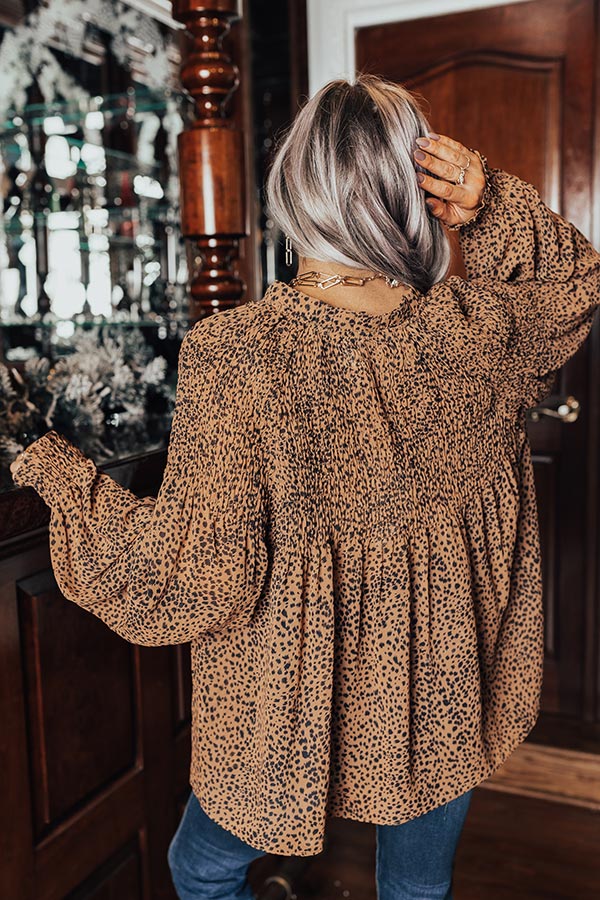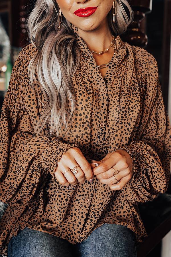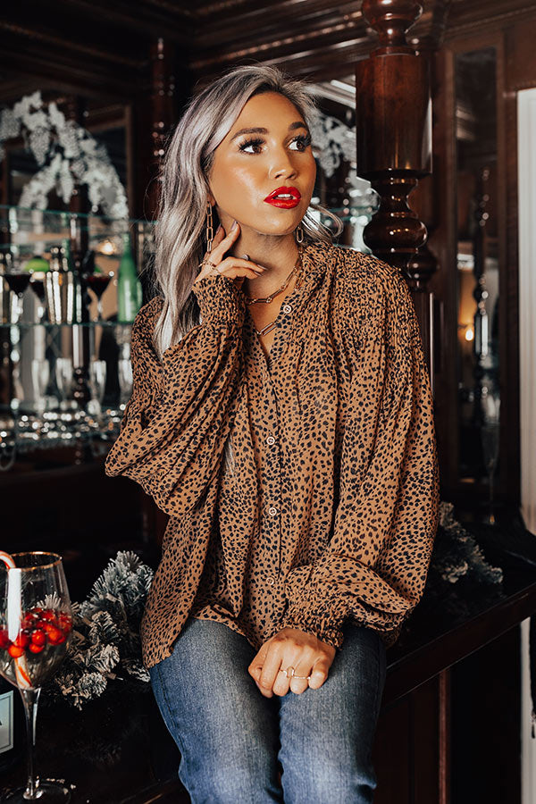 Spend a night out in style with this striking brown top featuring lightweight flowy material patterned with a black leopard print, a button down front with a v-cut neckline, long loose sleeves with button closure cuffs, and a relaxed silhouette that falls into a rounded hemline! Measurements