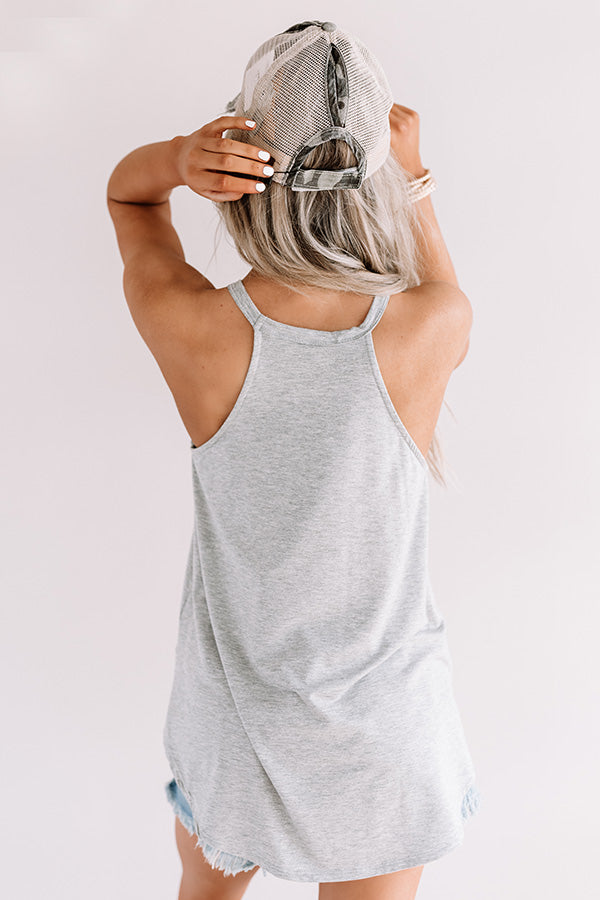 Other basic tanks don't compare to this adorable grey one featuring soft lightweight shift material, a high rounded neckline, thin sleeveless shoulder straps with a racerback fit, and an ultra relaxed silhouette that falls into a rounded tunic length hemline! The neutrality of this piece allows for endless styling options, like solo with some frayed denim shorts and a camo print wedged sneaker and baseball cap, but you can also wear it layered under a denim jacket with some distressed black skinnies, "The Brighton Espadrille in Grey," sunnies, and our "Nightlife Luxury Snake Print Tote in Grey!" Measurements