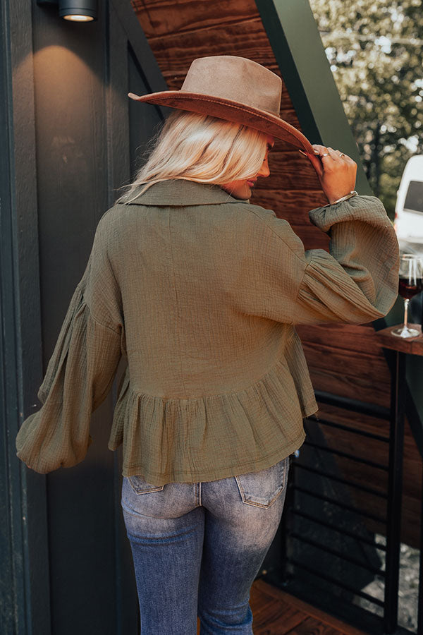 Our trendy 'No Hesitation' peplum top is the perfect piece to compliment your favorite jeans! Features comfortable olive colored material, collared v-neck, single button closure, long loose sleeves, relaxed silhouette that falls into a ruffled high-low hemline.