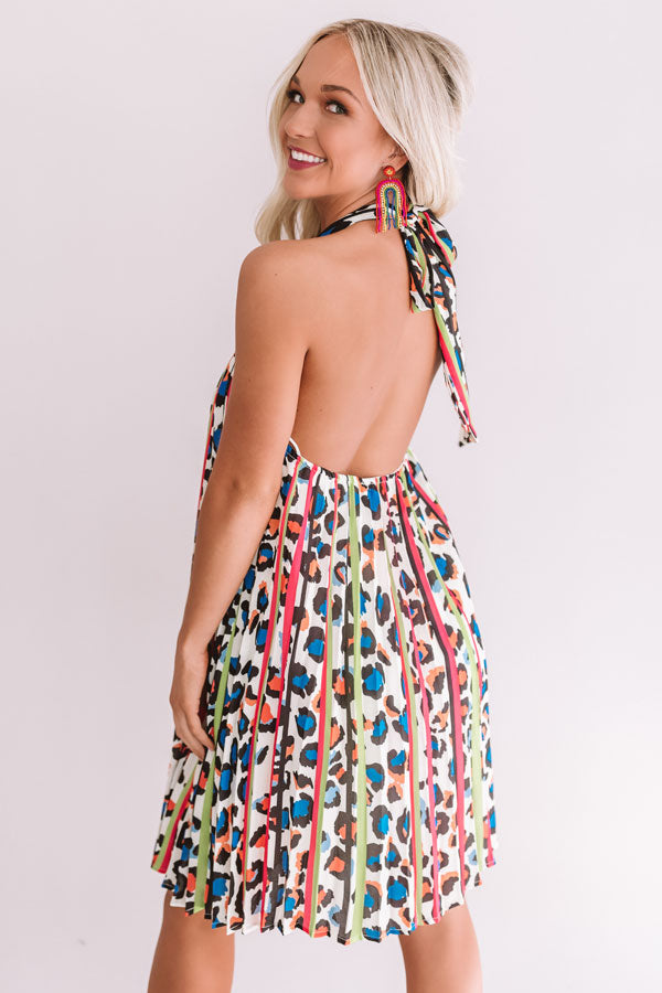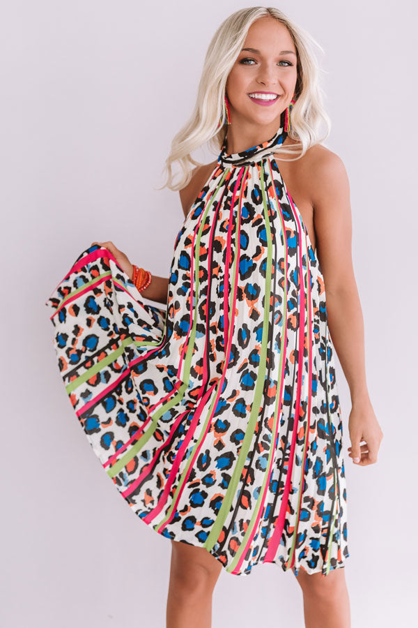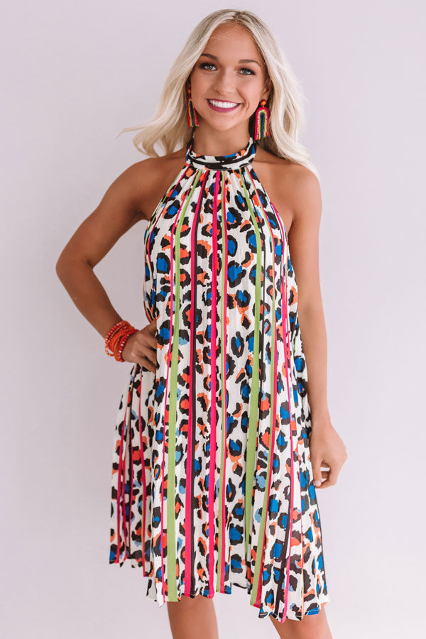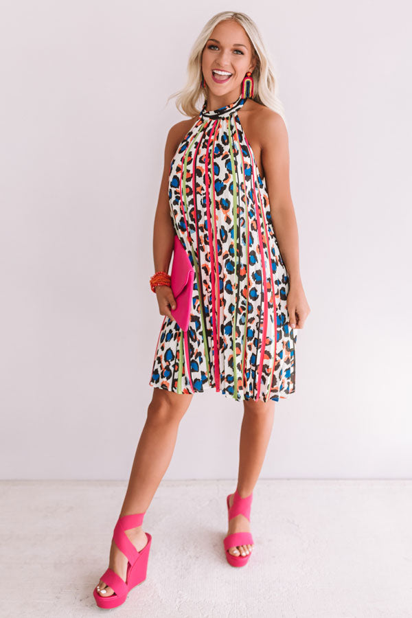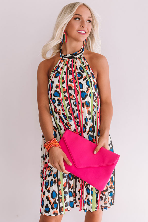 It will be hard to keep the paparazzi away in this energetic halter dress featuring a stunning leopard pattern, neon stripes, oversized pleats, and an open back with an elastic band! Style this incredible piece with hot pink shoes and accessories for a show stopping summer statement look!