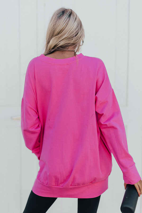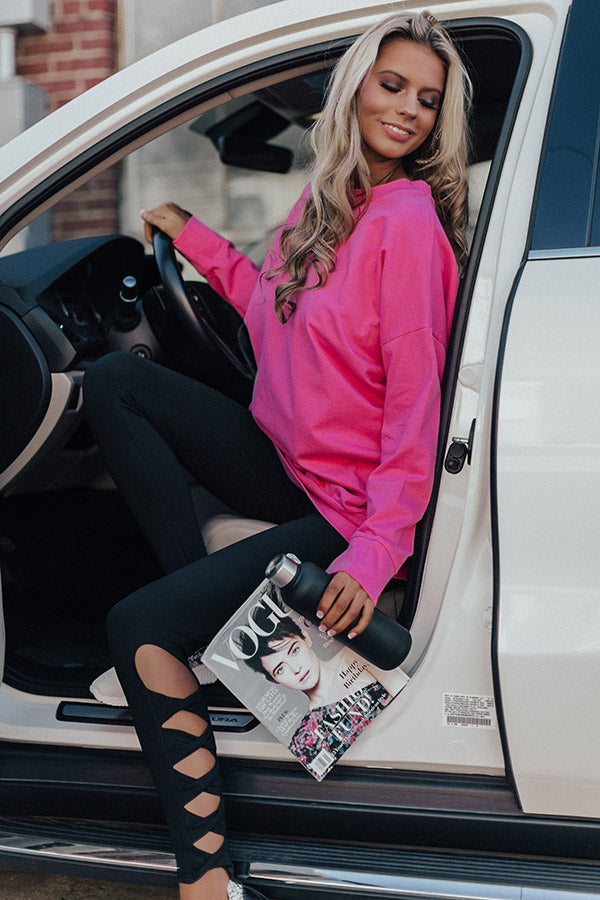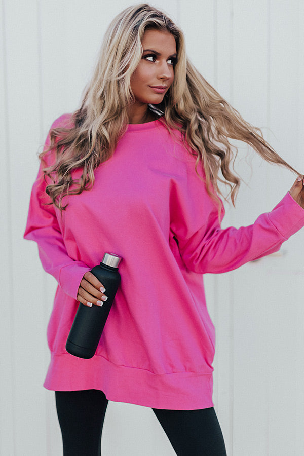 Our pink "No Place Like Home Tunic Sweatshirt" features soft lightweight material, a high rounded neckline, long loose sleeves with fitted cuffs, low accent side pockets, wide trim, and an ultra relaxed silhouette that falls into a straight upper-thigh length hemline! You can dress this vibrant piece down by wearing it with some black athleisure leggings and trendy sneakers, but you can also style it up by pairing it with some distressed light wash ankle skinnies, "The Calum Bootie in Grey," a faux leather backpack, and our "All Caught Up Headband in Grey!" Measurements