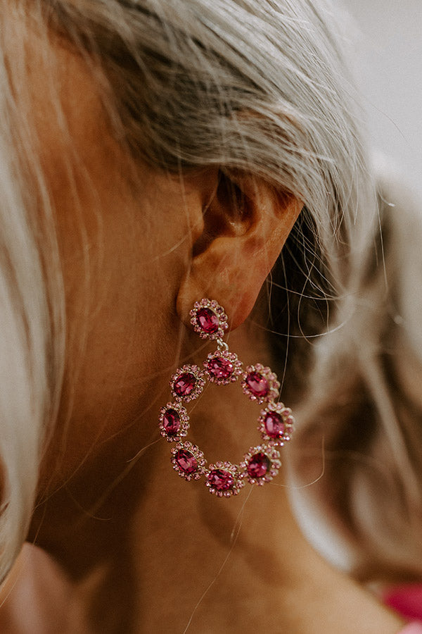 Shine bright with our shimmering pink 'No Troubles, All Bubbles' statement earrings featuring a rhinestone circle stud and a dangling rhinestone hoops!