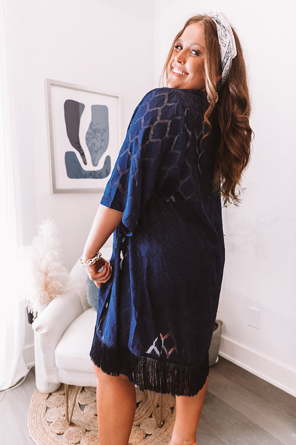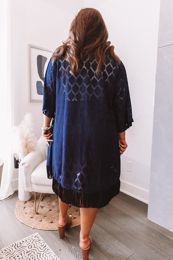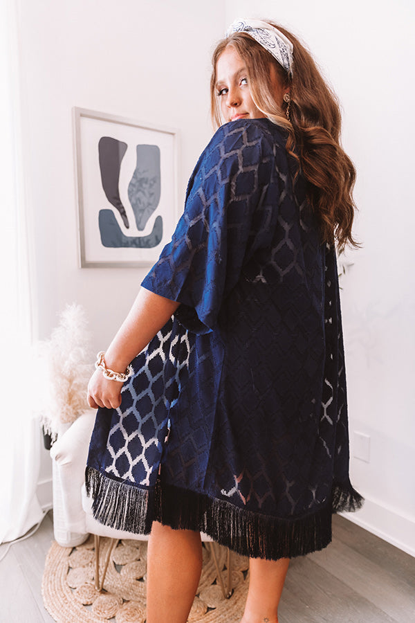 Plus Size - You will have no troubles putting together a cute OOTD when you have this navy overlay in your wardrobe! It features lightweight semi-sheer material with an abstract diamond pattern, loose half sleeves, and an ultra draped open front silhouette that ends in a straight knee-length hemline with tassel trim detailing and accent side slits!