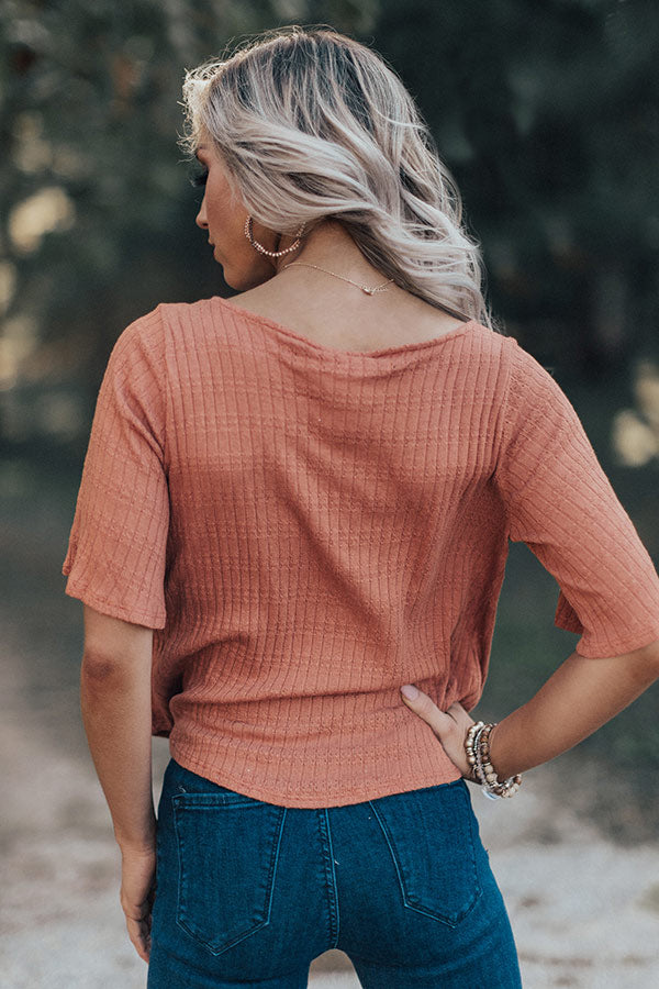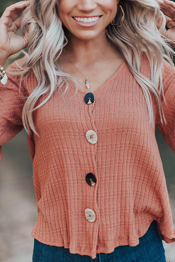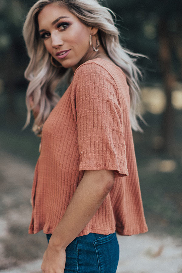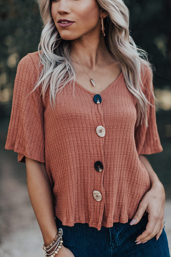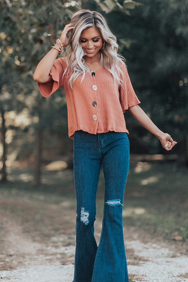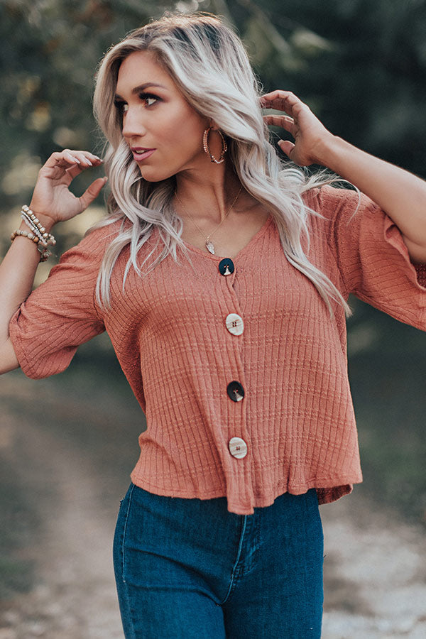 You will have "no troubles" deciding what to wear this fall when you have this pumpkin colored shift top in your wardrobe! It features lightweight material with subtle ribbed detailing, loose half-length sleeves, a button up bodice with a rounded neckline, and a relaxed silhouette that falls into a rounded hemline! This adorable transitional piece can be styled a variety of different ways, like with some distressed denim flares, or it can be layered under an ivory cardigan with some frayed black skinnies, "The Jess Faux Suede Heel in Natural," and a tan faux suede hat and tote! Measurements