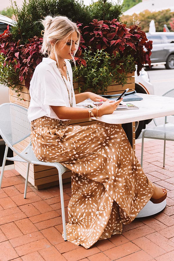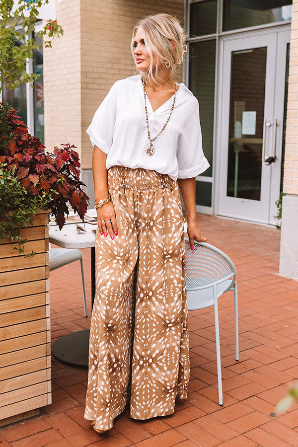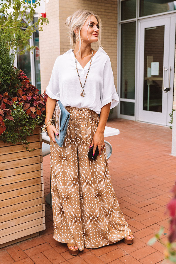 Strut on the wide side in our gorgeous light camel hued 'Non-Stop To Paradise' pants featuring lightweight flowy material patterned with a white spotted print, a wide and high smocked waistline, hidden side pockets, and a relaxed silhouette that falls into oversized ankle-length hemlines! Measurements