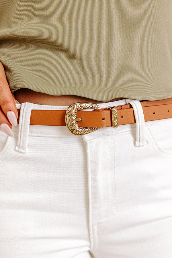 Complete your look in the most perfect of ways with our pretty camel colored 'Noon Skies' belt featuring a faux leather strap with a stamped vintage gold buckle!