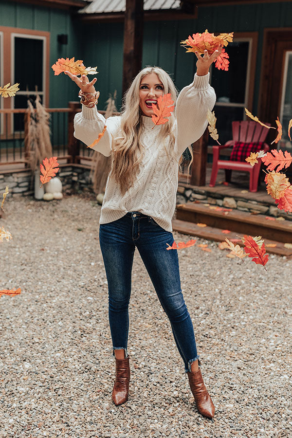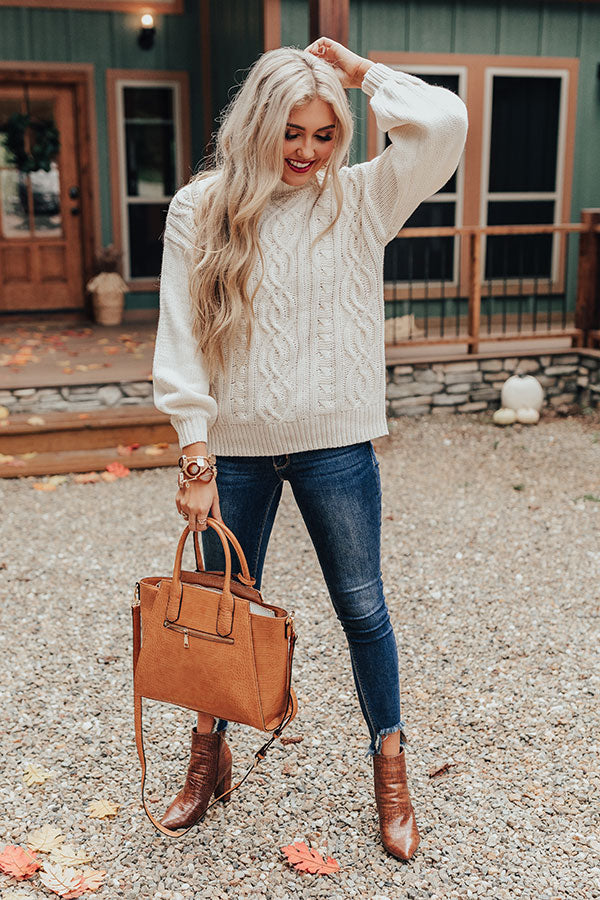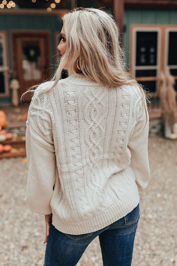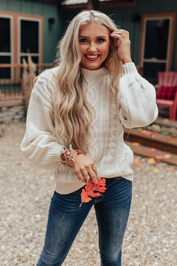 Make a statement in our adorable ivory colored "North Lake" sweater featuring ultra soft and thick material with cable knit texturing, a high rounded neckline, long oversized bubble sleeves with fitted cuffs, ribbed trim detailing, and a slouched silhouette that falls into a straight hemline! Measurements