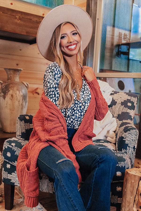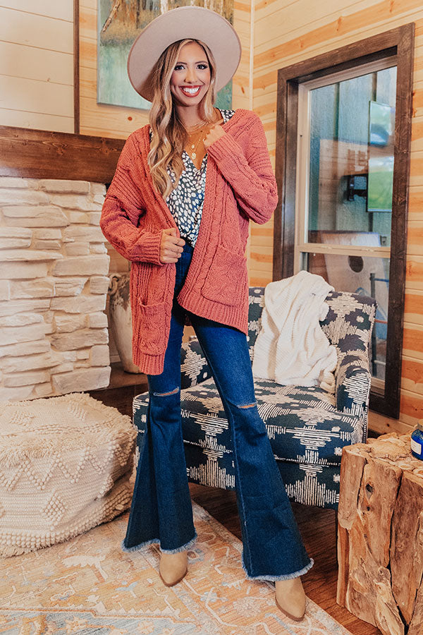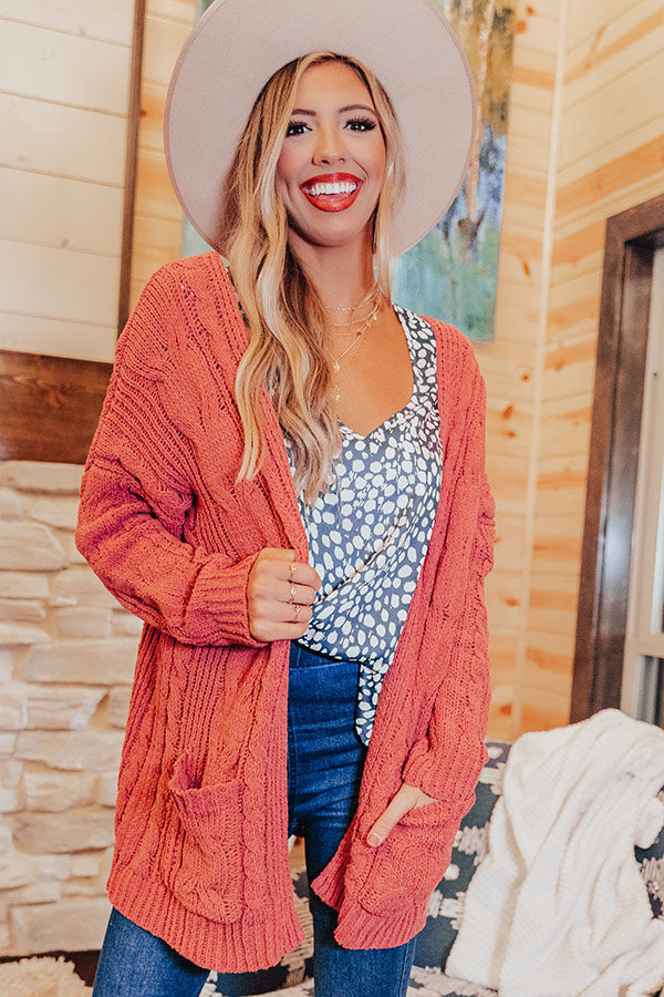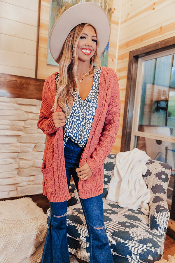 You deserve "nothing but the best," which is why you shouldn't hesitate to add this adorable luxe rose colored cardigan to your cart with its ultra soft and thick cable knit material, long loose sleeves, low accent side pockets, ribbed trim detailing, and draped open front silhouette that falls into a straight mid-thigh length hemline! Measurements