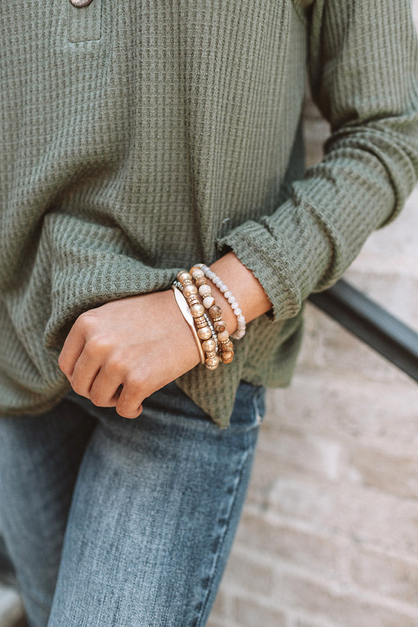 We think you will be as obsessed with this "notoriously chic" bracelet set as we are with its five pieces adorned with tan and neutral colored beads and a golden bangle!