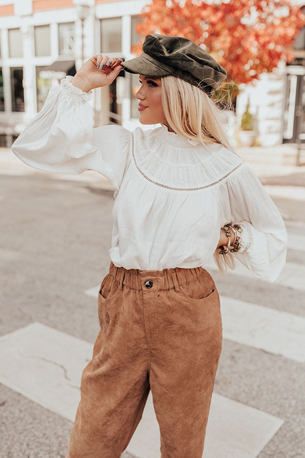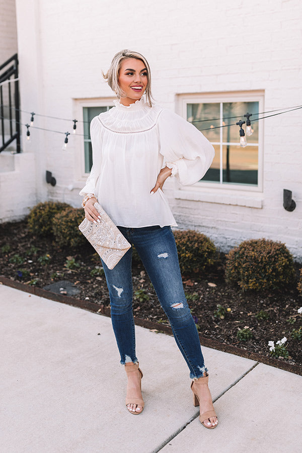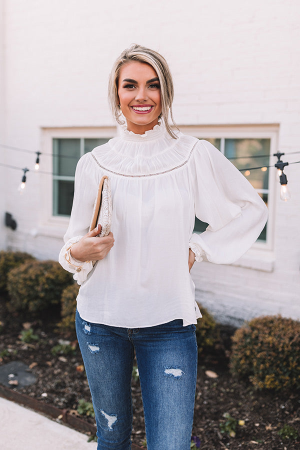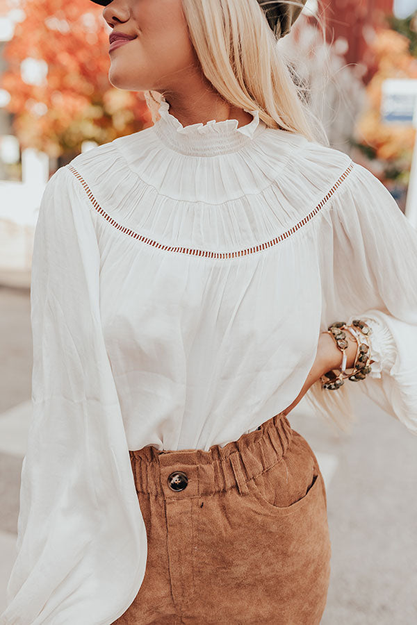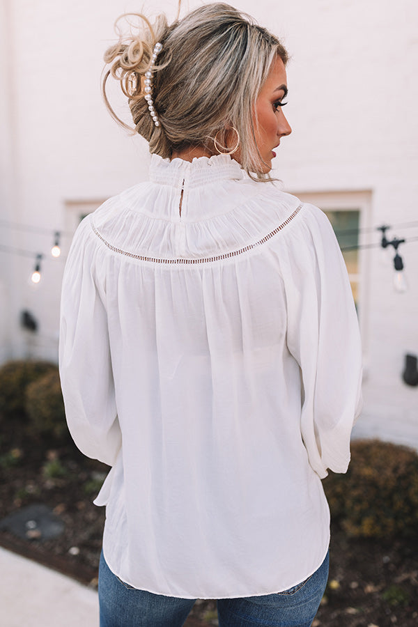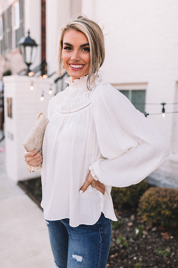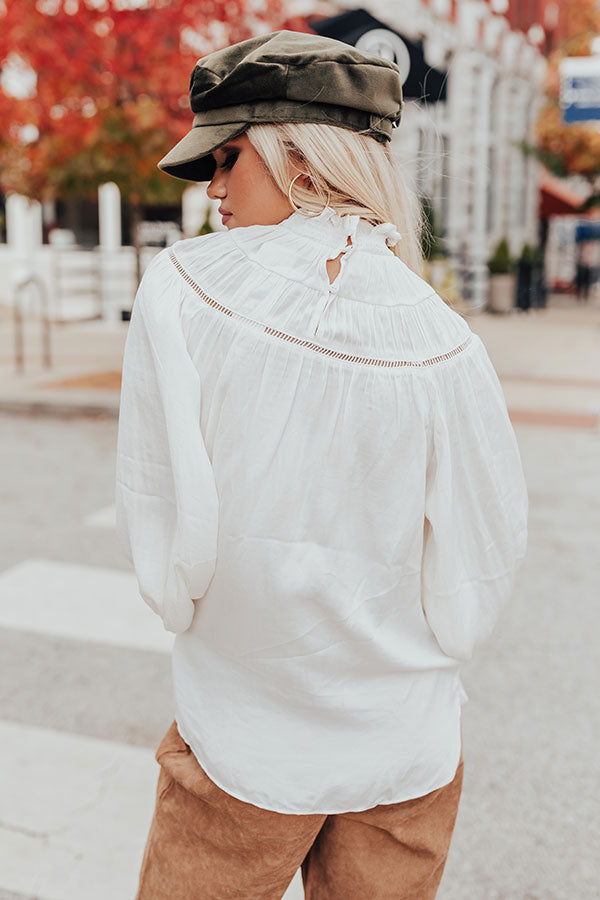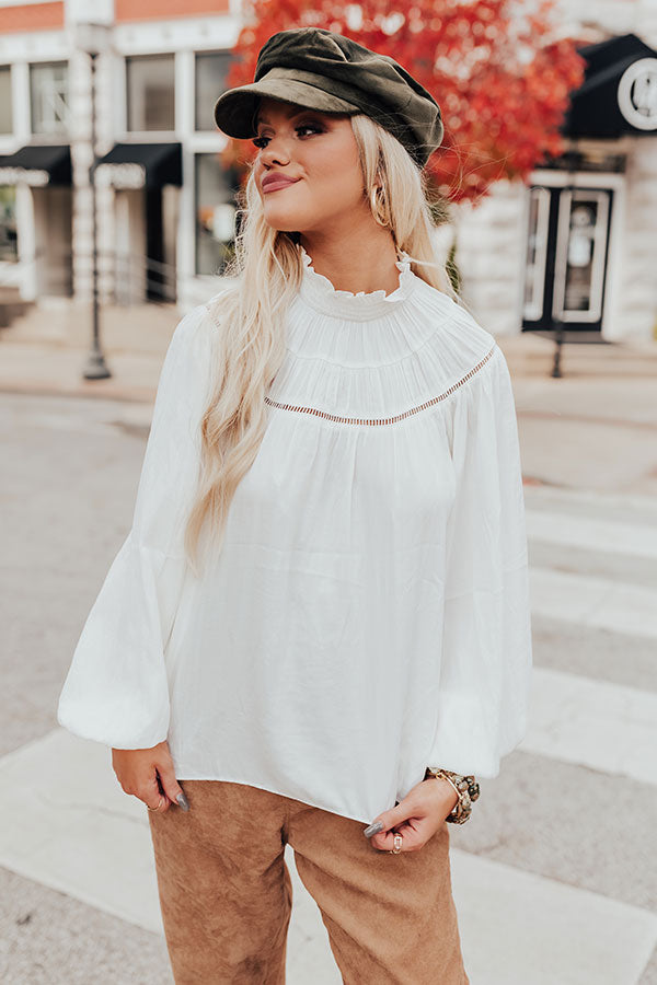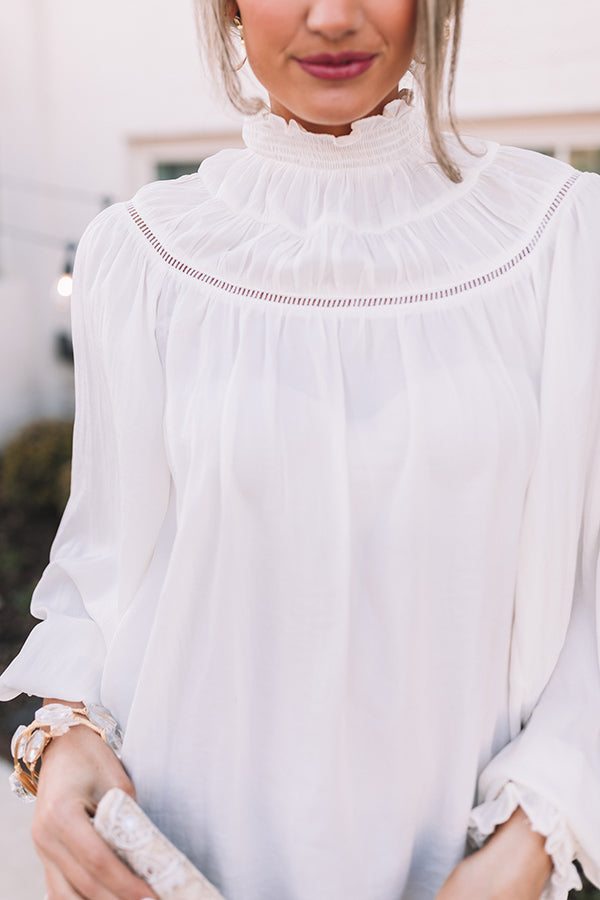 Upgrade your transitional style with our elegant white 'Notting Hill Shift Top' featuring lightweight breezy material, pleated detailing around the shoulders with a ruffled collar neckline, long bishop sleeves with fitted cuffs, a keyhole accented upper back with a button closure, and a relaxed silhouette that falls into a rounded hemline! Measurements
