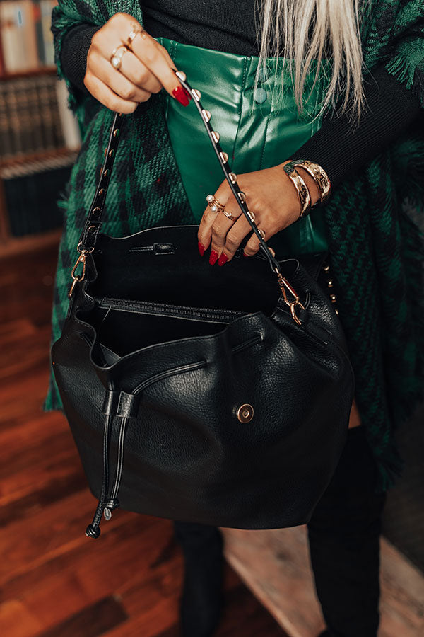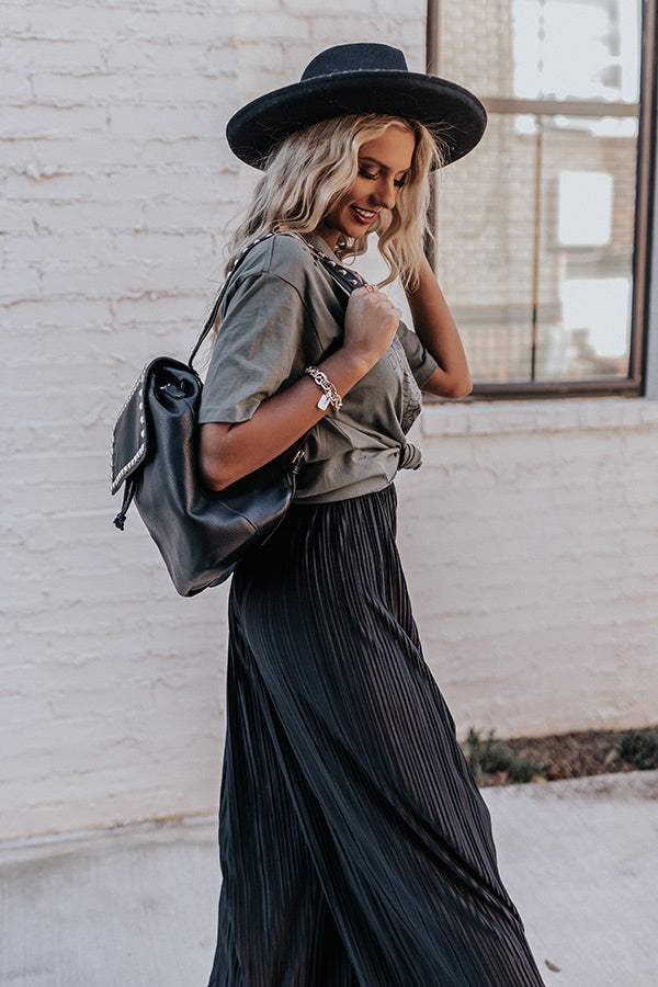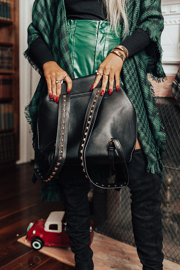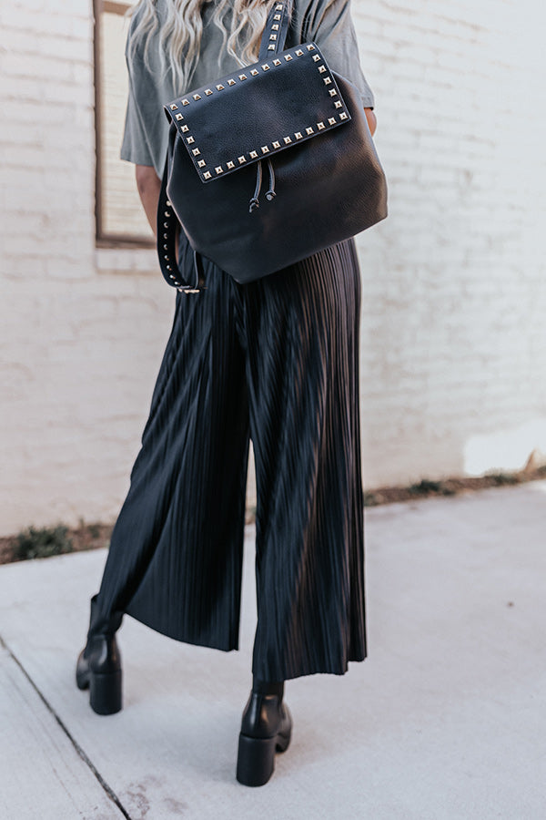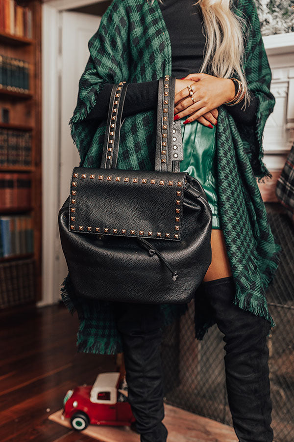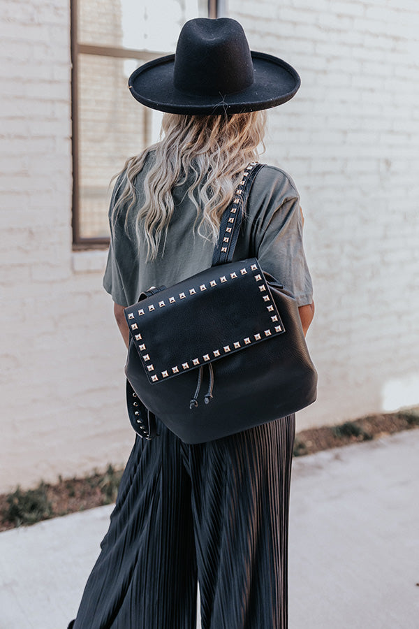 Looking for a way to elevate your casual bag style, then our trendy black 'Novel Romance' backpack is perfect for you! It features faux leather material with gold stud detailing, a rectangular flap closure with two snap button closure, two adjustable shoulder straps, and a spacious interior with a cinched closure and additional inside pockets and pouches!