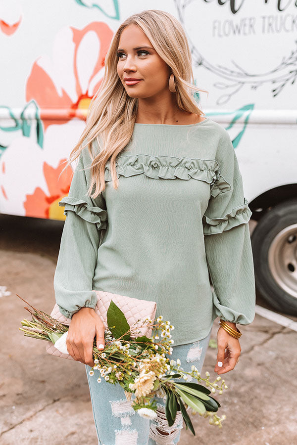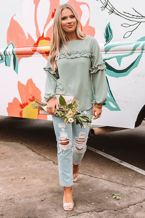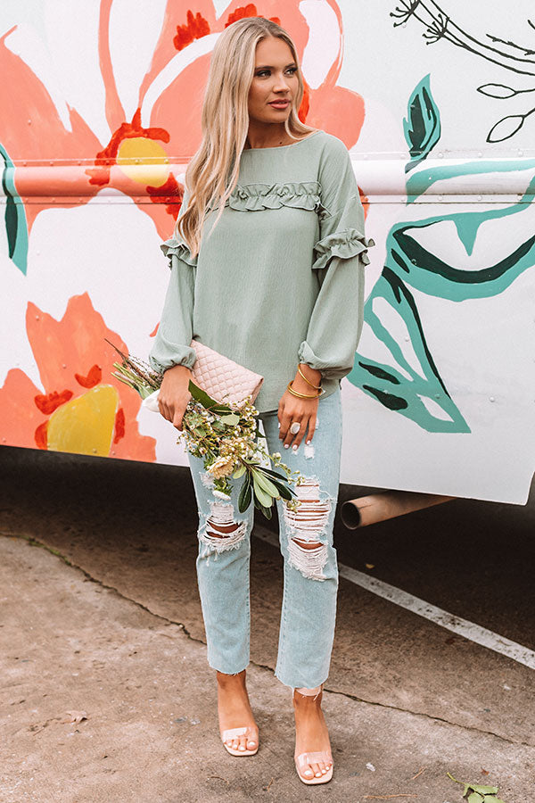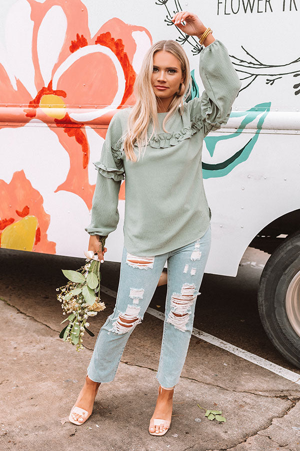 There is no better time than now to add this adorable pear colored shift top to your cart! It features ultra lightweight material, a high rounded neckline, long oversized bishop sleeves with fitted elastic banded cuffs, ruffled seam detailing, and a relaxed silhouette that falls into a rounded hemline with accent side slits! We have styled this cutie with some distressed ankle skinnies and a neutral mule heel and cutch, but you can also wear it with some frayed white shorts, "The Tipton Espadrille in Grey," and our "All Caught Up Headband in Grey!" Measurements
