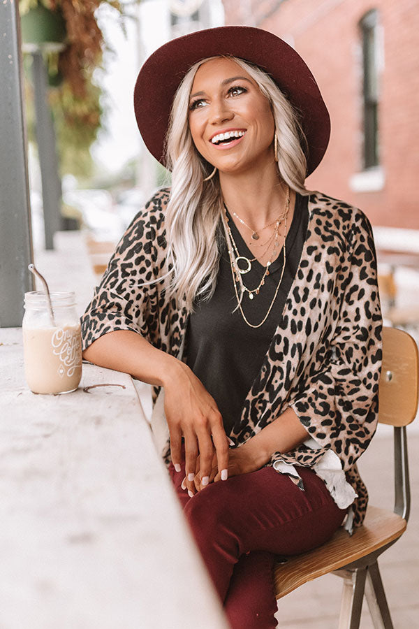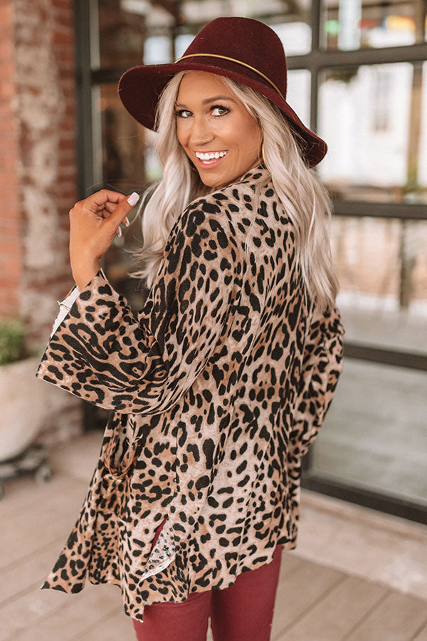 We would like to announce that the cutest transitional cardigan is "now trending" with its fierce leopard print, long flowy sleeves, an open front with two pockets, a straight silhouette, and an upper thigh hemline length! Layer this incredible piece over