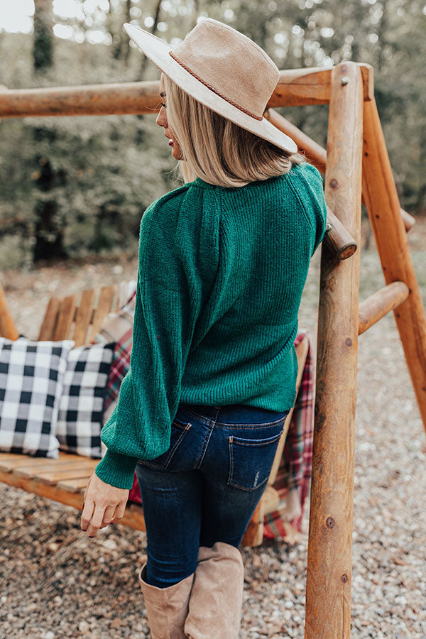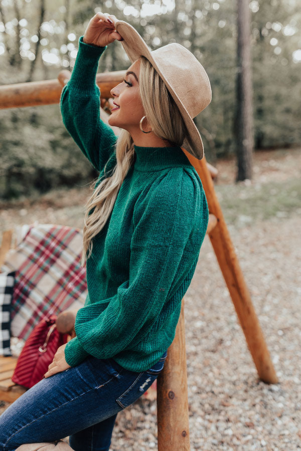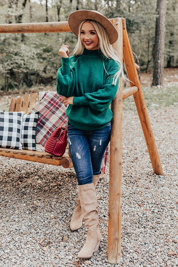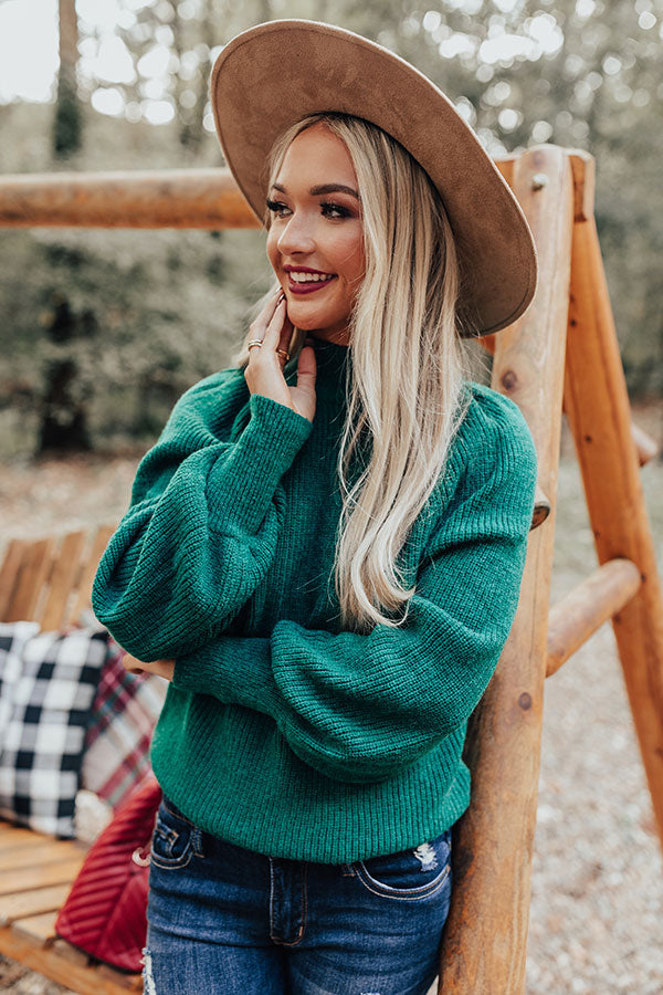 Gear up for a chilly "NYC fall" in this darling hunter green sweater featuring ultra soft lightweight tight knit material with ribbed texturing, a high collared neckline, long oversized bubble sleeves with fitted forearm cuffs, and a relaxed silhouette that falls into a straight hemline! Measurements