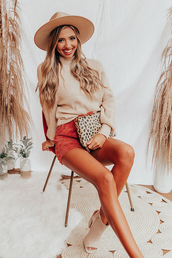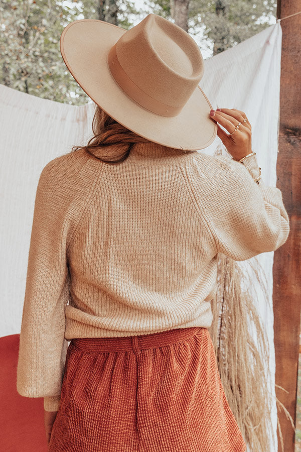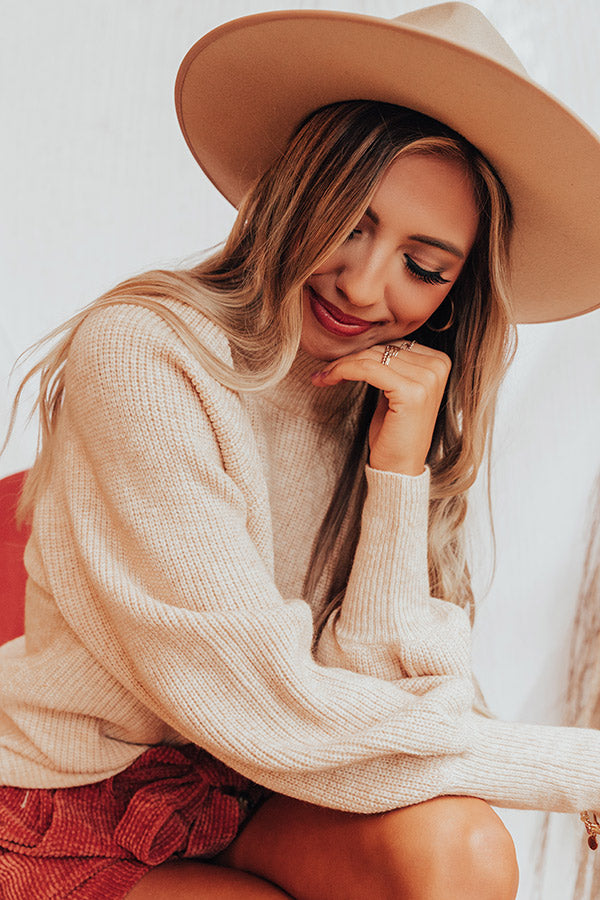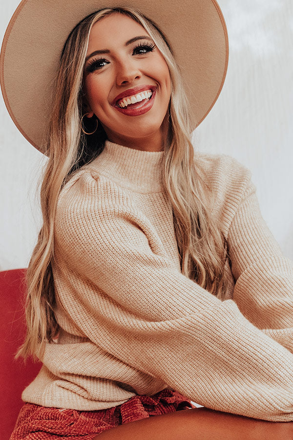 Gear up for a chilly "NYC fall" in this darling iced latte colored sweater featuring ultra soft lightweight tight knit material with ribbed texturing, a high collared neckline, long oversized bubble sleeves with fitted forearm cuffs, and a relaxed silhouette that falls into a straight hemline! Measurements