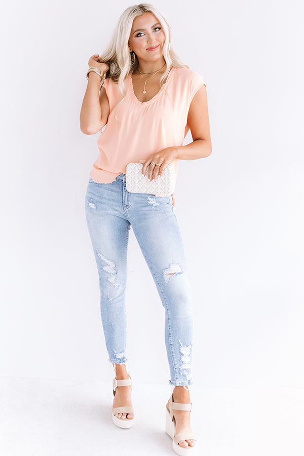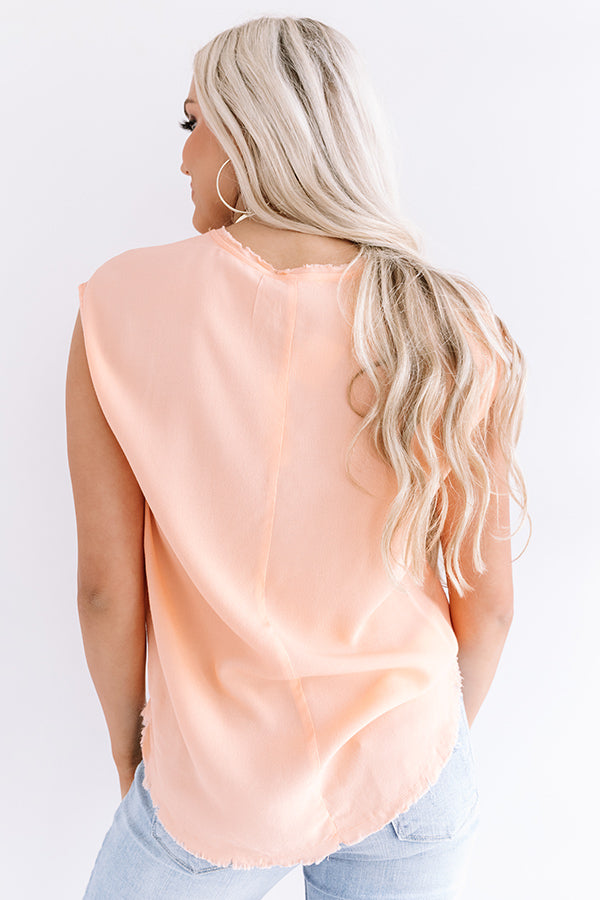 Your options are endless with our casual cute peach colored "NYC Influencer Shift Top" featuring sleek lightweight material, a scooped neckline with cap sleeves, frayed edge detailing, and a relaxed silhouette that falls into a rounded hemline! You can style this chic piece a variety of ways, like with some distressed ankle skinnies, neutral wedges, and a chic clutch, but you can also wear it with some frayed white shorts, our "Ray Of Light Sunnies in Peach," and "The Avonlea Espadrille in Cinnamon!" Measurements