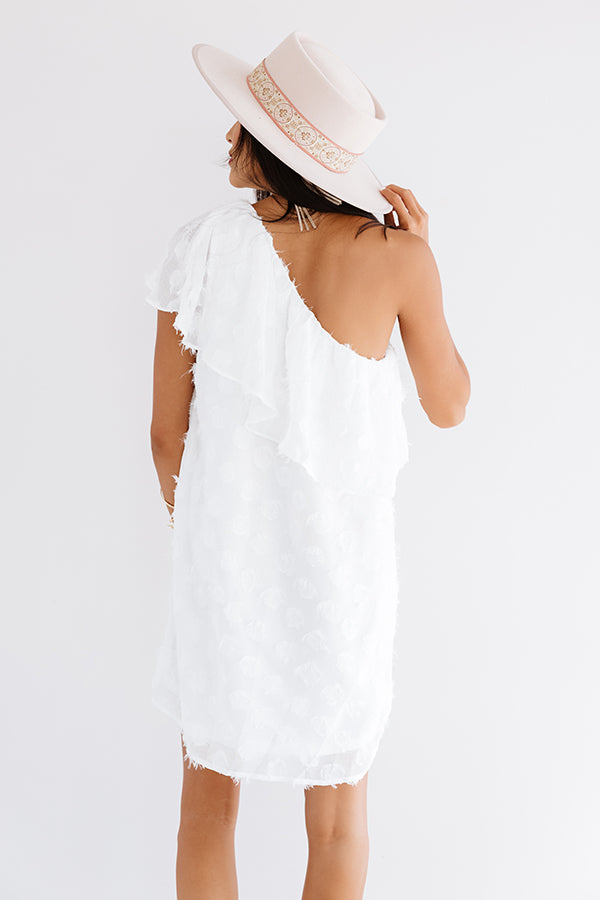 You are sure to be a summer stunner in our adorable white "NYC Penthouse Shift Dress" featuring lightweight breeze material patterned with large fringe polka dots, a diagonal neckline with an oversized overlay bodice and single shoulder strap, and an ultra relaxed silhouette that falls into an uneven mid-thigh length hemline! We have styled this charming piece with a neutral heel and statement earrings and a light blush hued wool hat and faux leather crossbody, but you can also wear it the "Steve Madden Gigi Ankle Strap Rhinestone Heel!" Measurements