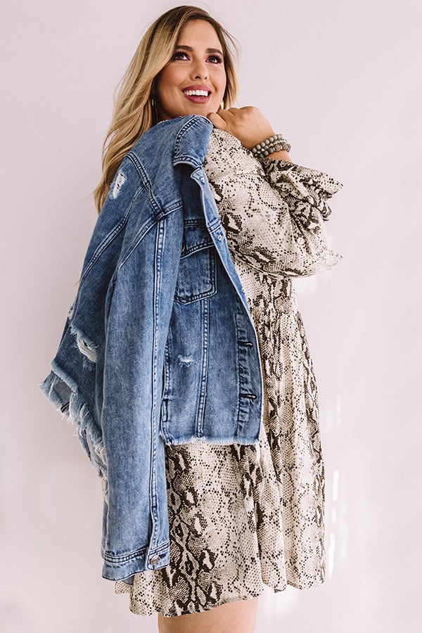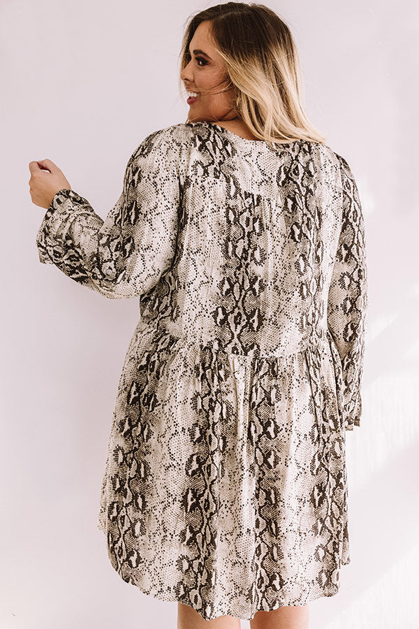 Plus Size - We think this shift dress is the ideal piece to wear when taking in all those "NYC sights" with its lightweight material patterned with a black and neutral snake print patter, a v-cut neckline, long loose bishop sleeves with fitted elastic banded cuffs, and a relaxed silhouette that falls into an uneven mid-thigh length hemline! This striking piece can be accessorized multiple different ways like with black peep toed block heels and a maroon crossbody and faux suede hat, or it can be styled with "The Haven Faux Suede Knee High Boot in Black" and our "All Caught Up Headband in Black" for multiple street style outfits that are sure to turn heads! Measurements