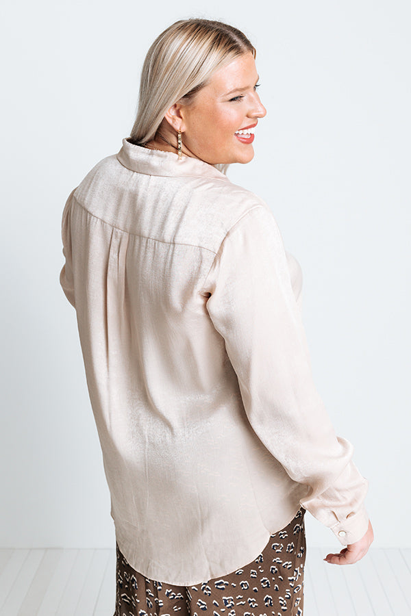 Keep your office wardrobe versatile with our chic plus size light birch hued 'NYC Smiles' top featuring sleek lightweight material, a button up front with a collared neckline, long loose sleeves with button closure cuffs, and a relaxed silhouette that falls into a rounded hemline! Measurements