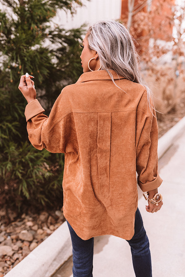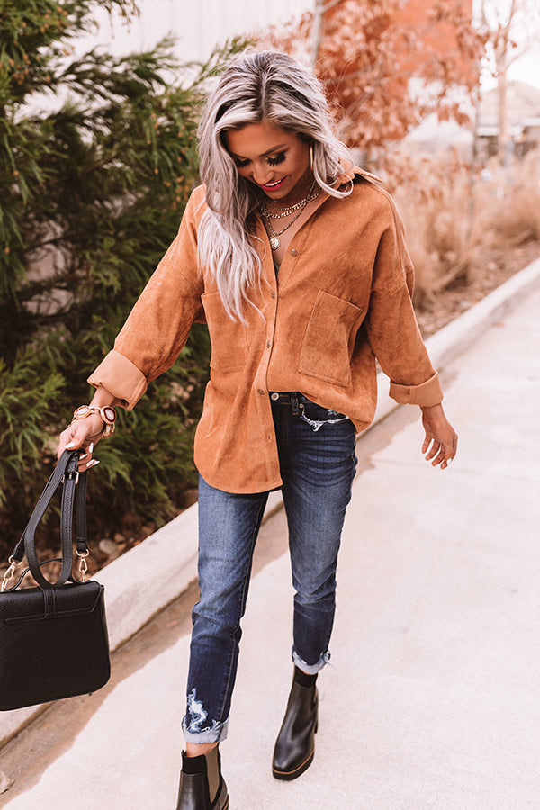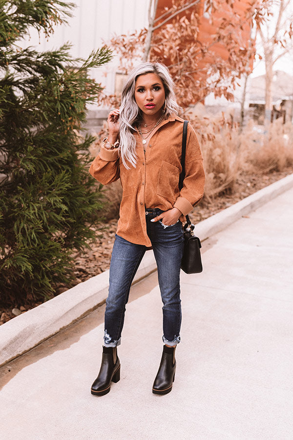 Stay casual but chic in our fashionable camel colored 'NYC Studio' top featuring lightweight corduroy material, a button up front with a collared v-cut neckline, long loose sleeves with button closure cuffs that can be rolled, two oversized accent chest pockets, and a slouched silhouette that falls into a rounded hemline! Measurements