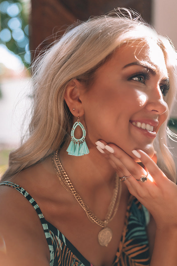 There is no better jewelry to wear on a summer vacay than our darling light blue hued 'Ocean Eyes' statement earrings featuring dangling woven teardrop hoops with beaded trim detailing and accent tassels!