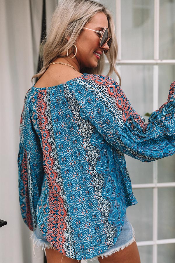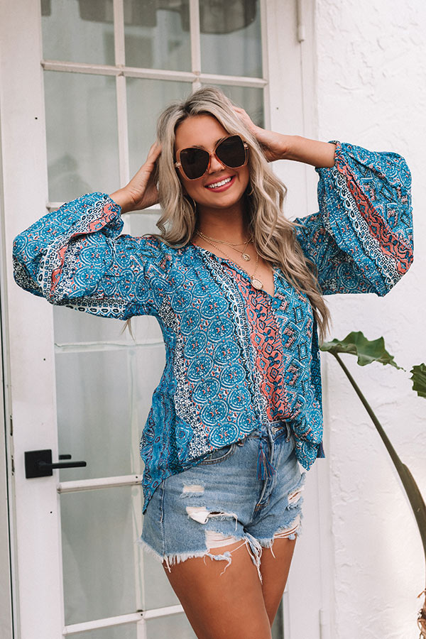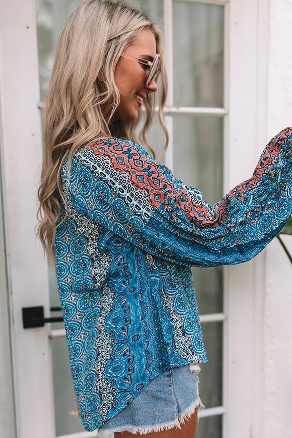 Keep your summer style unique in our eye-catching blue hued 'Ocean Eyes Shift Top' featuring lightweight breezy material patterned with intricate boho prints, a v-cut neckline with a tie closure, oversized bubble sleeves, and a relaxed silhouette that falls into a rounded hemline!