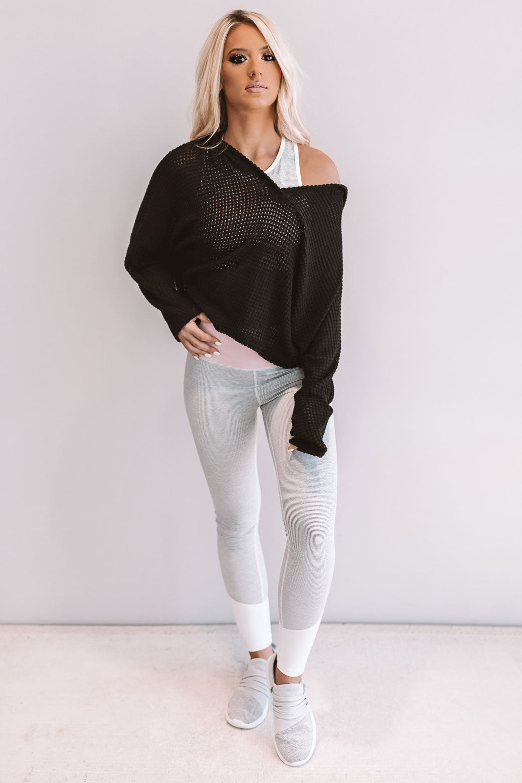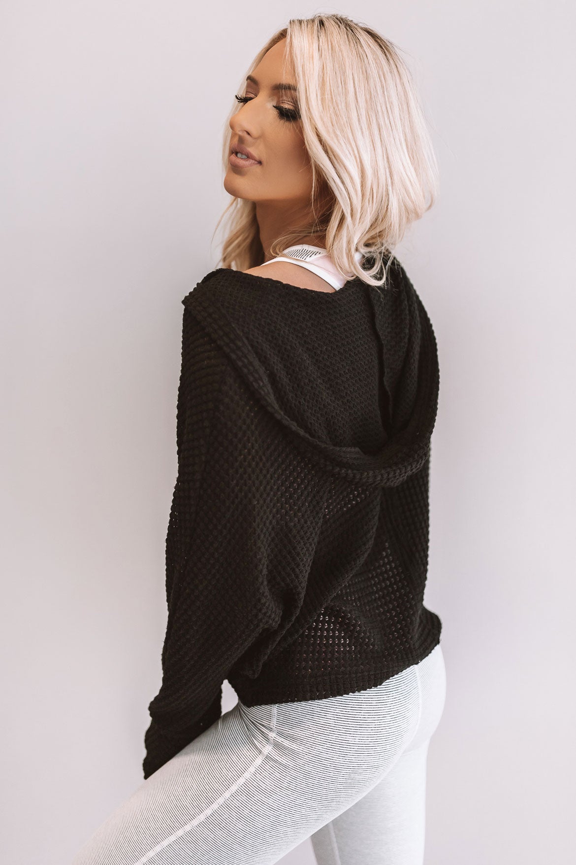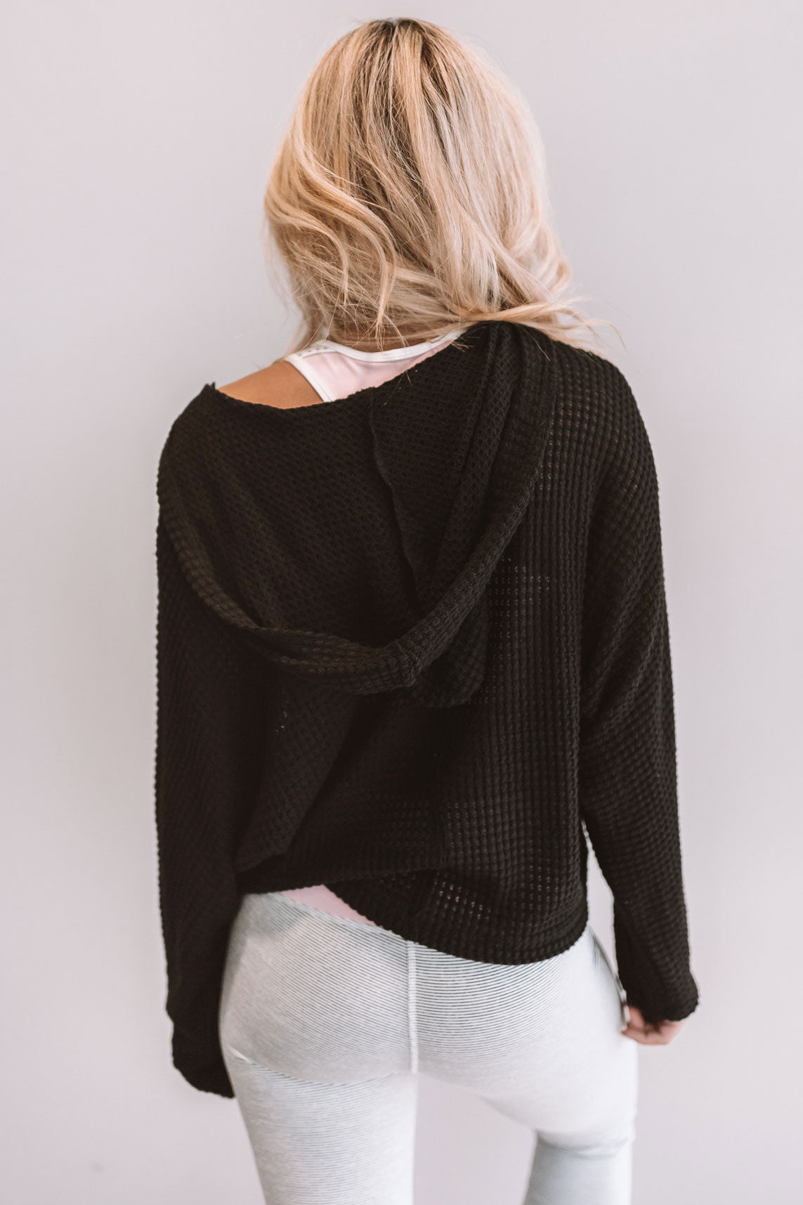 This light weight knit hoodie has a cropped fit & a v-cut neckline.