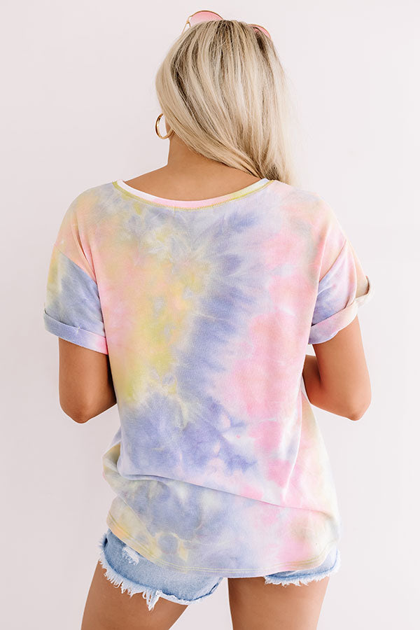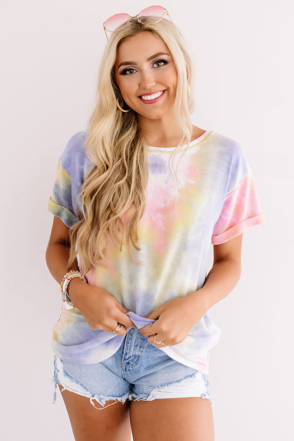 Live life colorfully in our adorable "Ocean Sunset" tee featuring soft lightweight material patterned with yellow, blue, and pink hued tie dye, a high rounded neckline, short loose sleeves with rolled cuffs, and a relaxed silhouette that falls into a rounded hemline! We have styled this cutie with some distressed denim shorts, matching sunnies, and trendy white sneakers, but you can also wear it with some white flares, "The Bowen Wedge in Blue," and our "Amalfi Adventure Woven Tote in Yellow!"