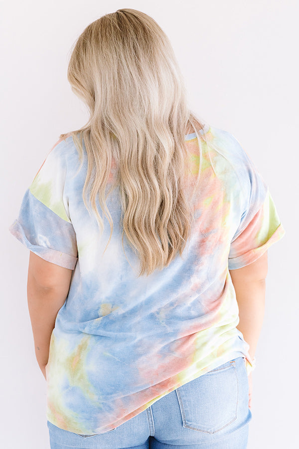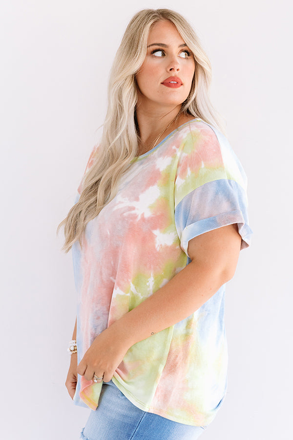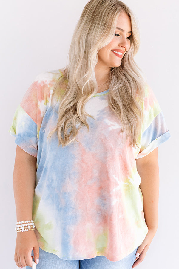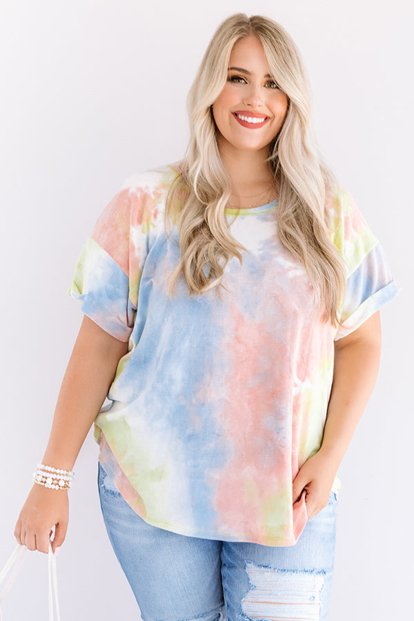 Plus Size - Live life colorfully in our adorable "Ocean Sunset" tee featuring soft lightweight material patterned with yellow, blue, and blush hued tie dye, a high rounded neckline, short loose sleeves with rolled cuffs, and a relaxed silhouette that falls into a rounded hemline! We have styled this cutie with some distressed skinnies and a trendy white sneaker and faux leather tote, but you can also wear it with some white shorts, "The Bowen Wedge in Blue," and our "Sunshine Suite Sunnies in Blush!"