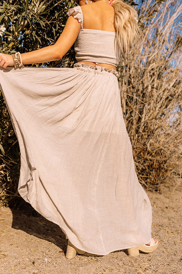 Get ready for summer effortlessly with our charming light taupe hued 'Ocean Walk Skirt' featuring lightweight breezy material, an elastic waistline with ruffle trim detailing and a tie closure, and a relaxed button down silhouette that cascades into a straight ankle-length hemline with a center slit!