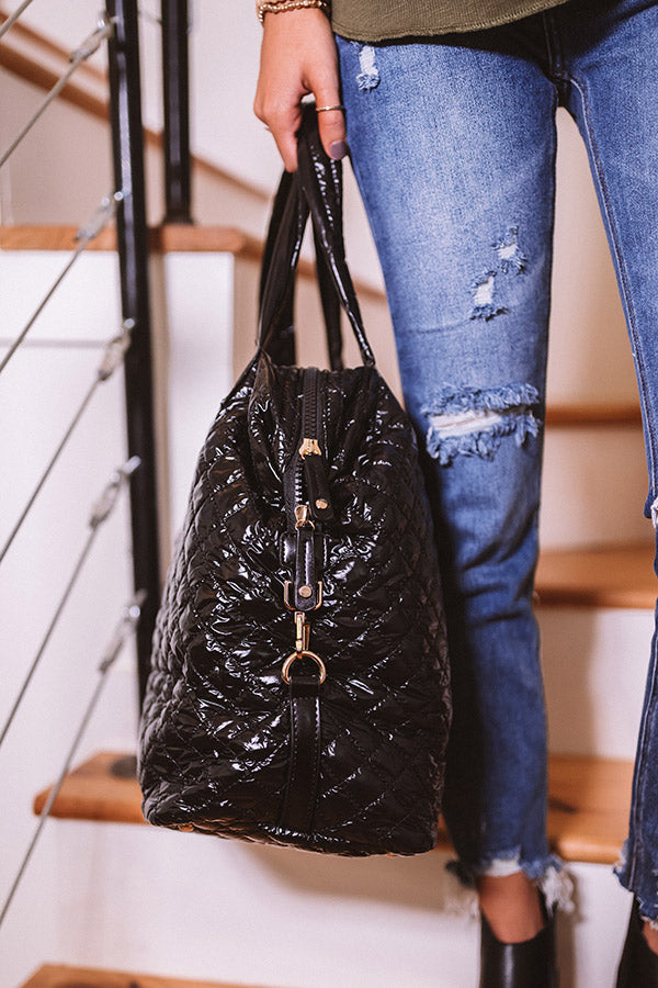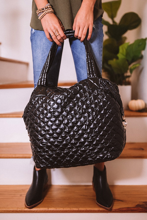There is no better bag to grab when "off the clock" than this adorable black tote featuring sleek material patterned with quilted texturing, two wide tote handles, and a lightweight large size silhouette with a zip closure and additional inside pockets!
