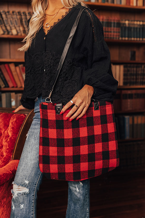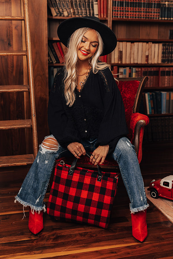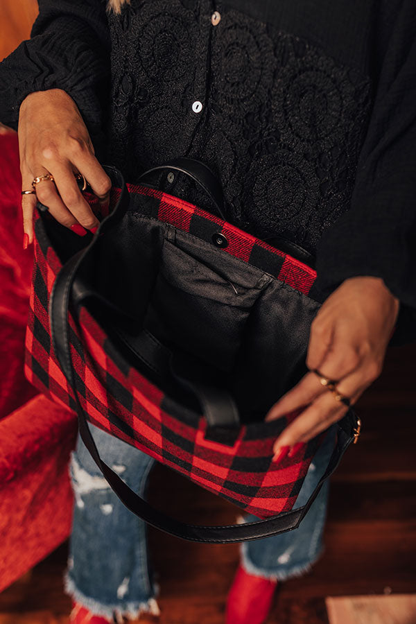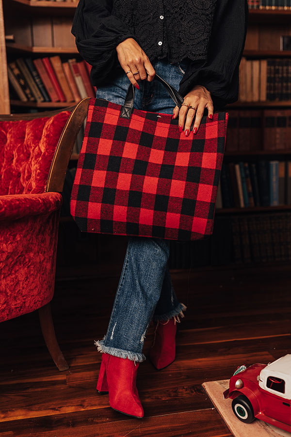We would just like to say off the record that this is our FAVE holiday tote! It features a red and black buffalo check pattern, two tote handles and a removable and adjustable shoulder strap, and a spacious fully lined interior!