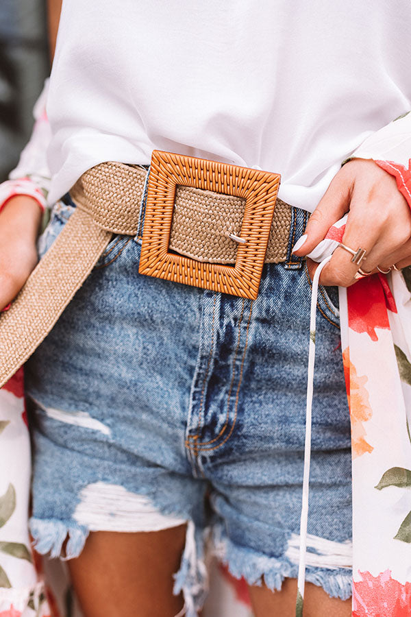 Complete your look with our adorable 'Off The Tropics' belt featuring a wide woven khaki colored strap and an oversized raffia square buckle! Length: 42.5 Inches