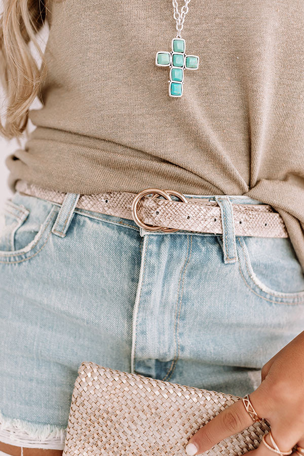 We are "officially obsessed" with this chic statement belt featuring a thin birch colored snake print band and a gold two loop buckle!