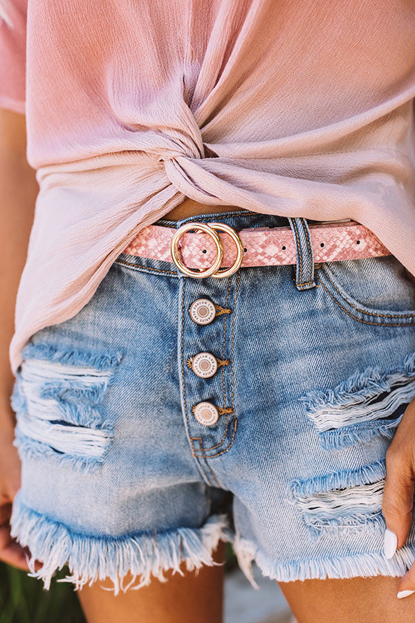 We are "officially obsessed" with this chic statement belt featuring a thin blush colored snake print band and a gold two loop buckle!