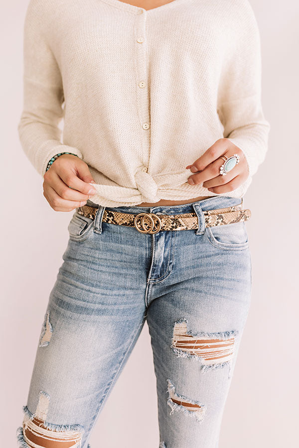 We are "officially obsessed" with this chic statement belt featuring a thin brown snake print band and a gold two loop buckle!