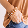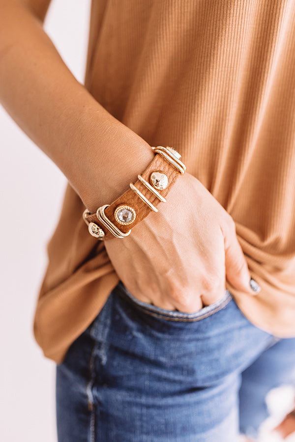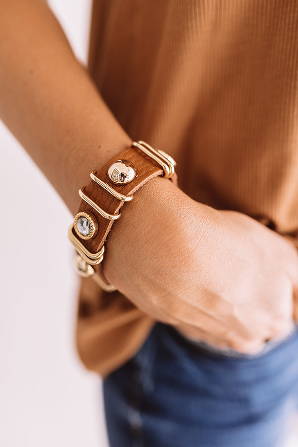Oh snap! We have never seen a bracelet this cute! It features gold metal band and faux diamond accents set inside a brown faux leather band with a two button snap closure!