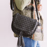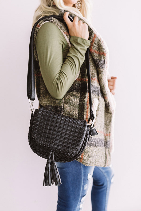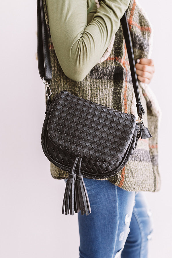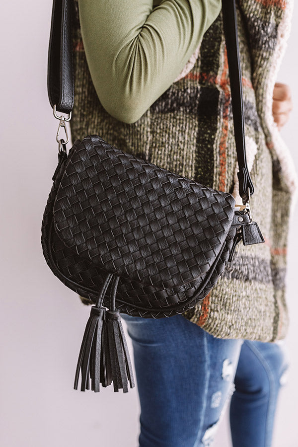 You are sure to look "oh so gorgeous" when you accessorize with this black crossbody featuring woven faux leather material, a flap closure with a button snap and tassel accents, a spacious zip up pocket with additional pockets, and a removable and adjustable shoulder strap!