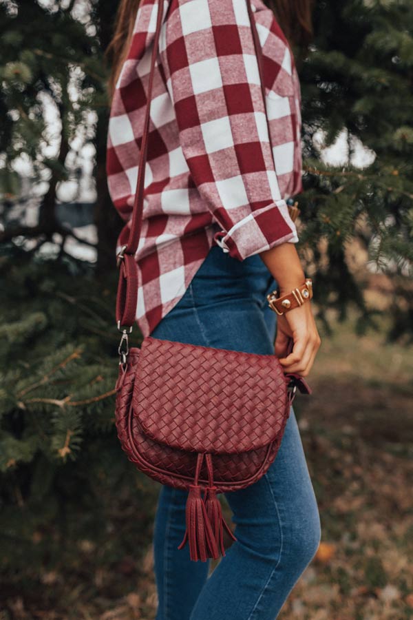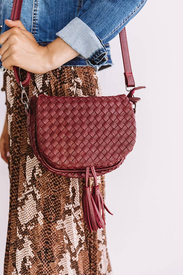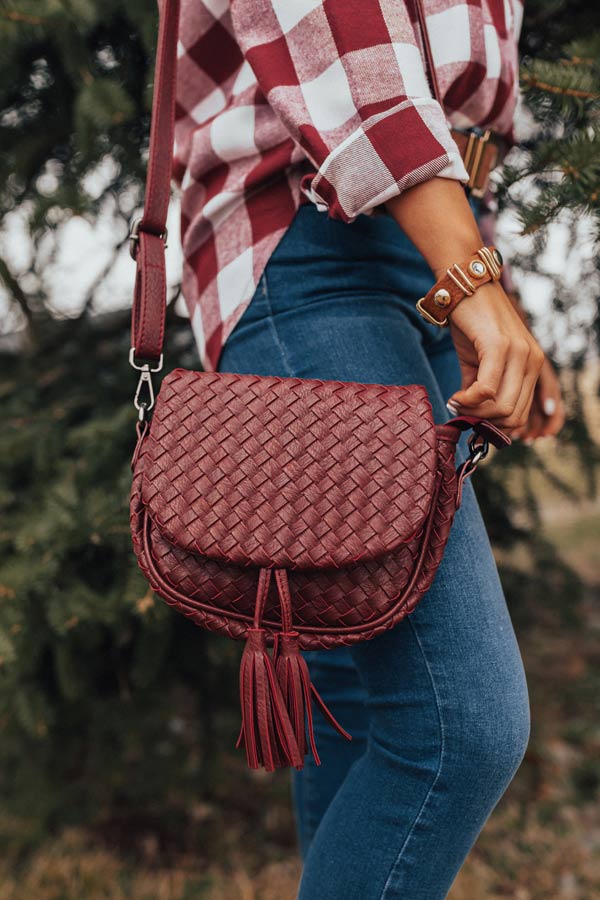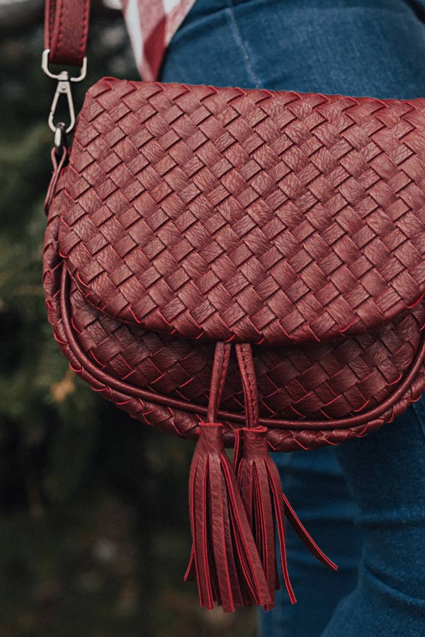 You are sure to look "oh so gorgeous" when you accessorize with this wine crossbody featuring woven faux leather material, a flap closure with a button snap and tassel accents, a spacious zip up pocket with additional pockets, and a removable and adjustable shoulder strap!