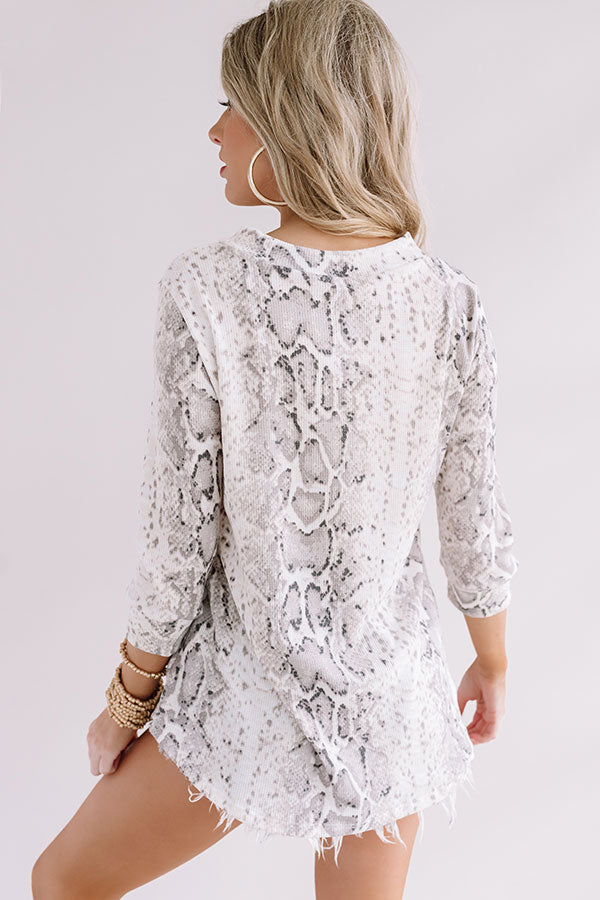This striking shift top is "oh so sweet" with its soft lightweight material patterned with a grey/brown snake print, subtle ribbed texturing, a button up bodice with a v-cut neckline, loose 3/4-length sleeves with fitted cuffs, and a relaxed silhouette that falls into a rounded hemline! We have styled this cutie with some frayed denim shorts and trendy sneakers, but you can also wear it layered under a white jacket with some black flares, "The Underwood Faux Leather Wedge in Grey," and our "All Business Faux Leather Tote in Grey!" Measurements