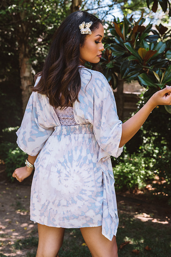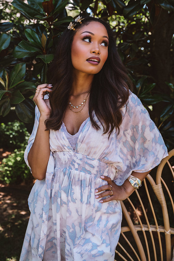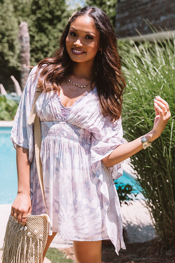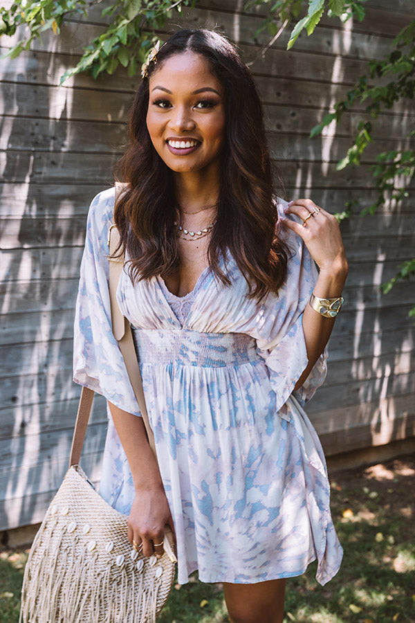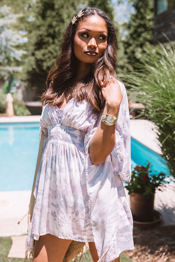 We guarantee you will turn heads in our adorable "On A Beach" dress featuring lightweight material patterned with purple and blue hued tie due, a deep v-cut neckline, bat wing half sleeves that extend down both sides, a wide smocked waistline, a square cutout back with a button closure, and a relaxed skirt silhouette that falls into an uneven mid-thigh length hemline! This charming piece styles perfectly with some neutral wedges, a woven fringe crossbody, and butterfly hair clips, but you can also wear it with "The Lula Heel in Lavender" and our "Maui Magic Earrings in Airy Blue!" Measurements
