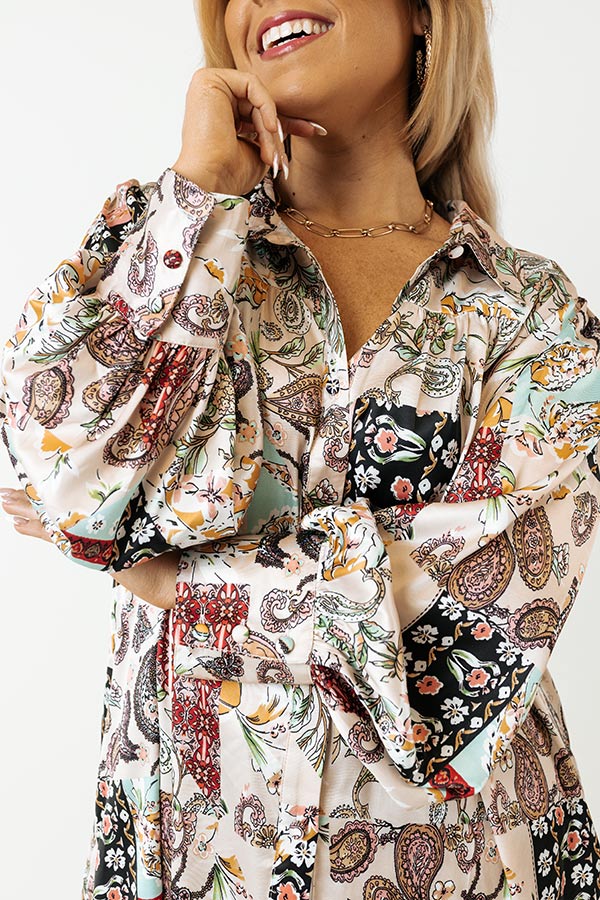 End getting dressed on a high note with this eye-catching top featuring lightweight satin material patterned with a variety of intricate prints, a button down front with a collared neckline, long loose sleeves with button closure cuffs, and a relaxed silhouette that falls into a straight hemline!